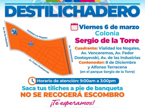 Leer másChihuahua, Chih.- El Gobierno Municipal, a través de la Dirección de Servicios Públicos Municipales, informa a la ciudadanía el cambio de colonia en el programa Destilichadero para este viernes 6 de marzo, el cual se ...