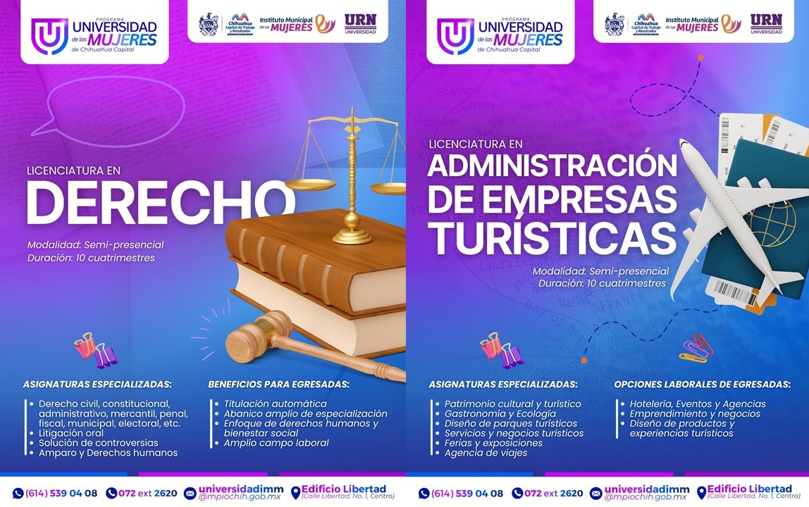 Chihuahua.- Con el objetivo de seguir generando más oportunidades de desarrollo profesional para las mujeres, el Gobierno Municipal de Chihuahua, a través del Instituto Municipal de las Mujeres (IMM), en alianza con la Universidad Regional del Norte (URN), inició las inscripciones a la Universidad de las Mujeres con las licenciaturas en Derecho y Administración de Empresas Turísticas.