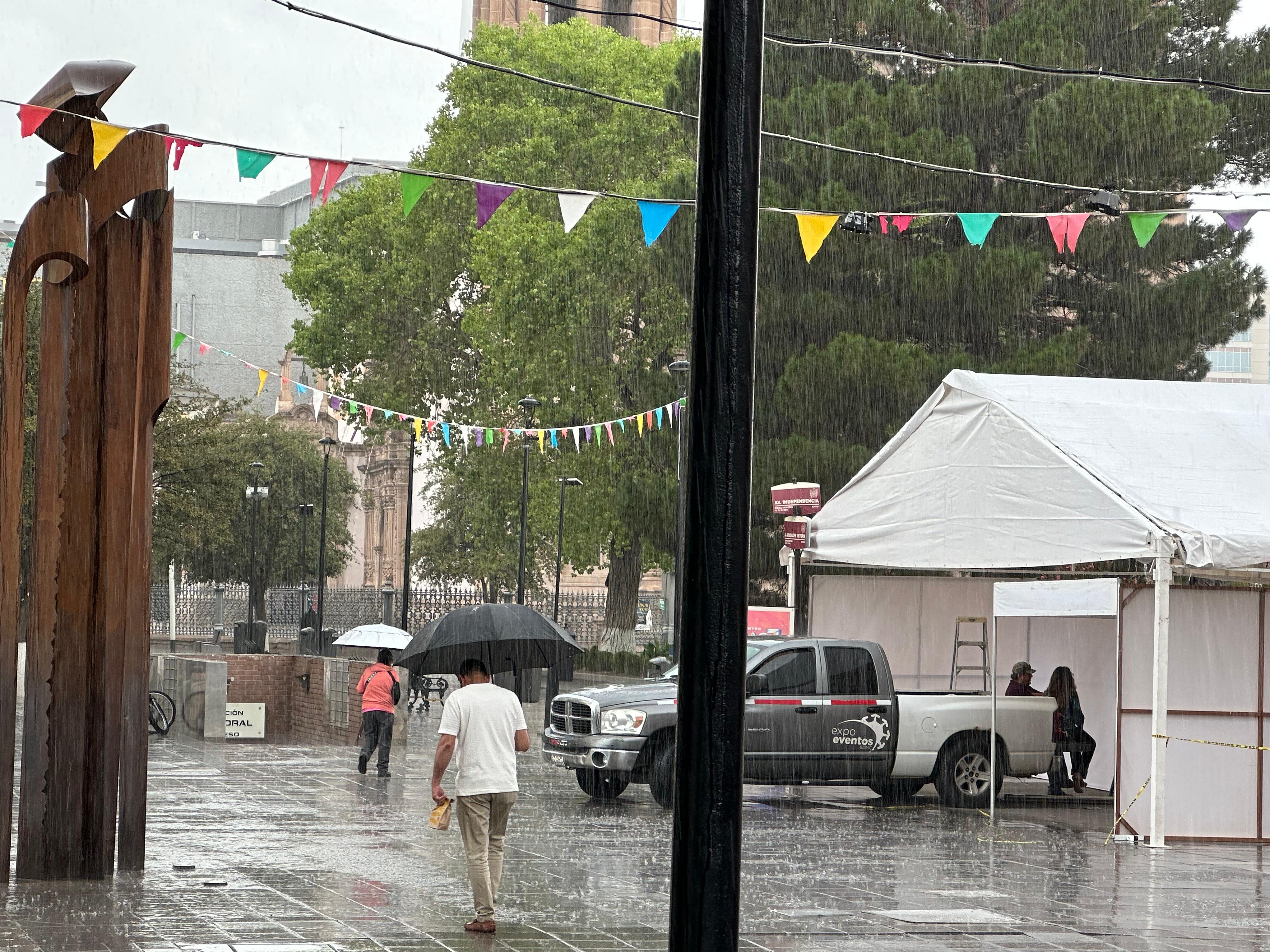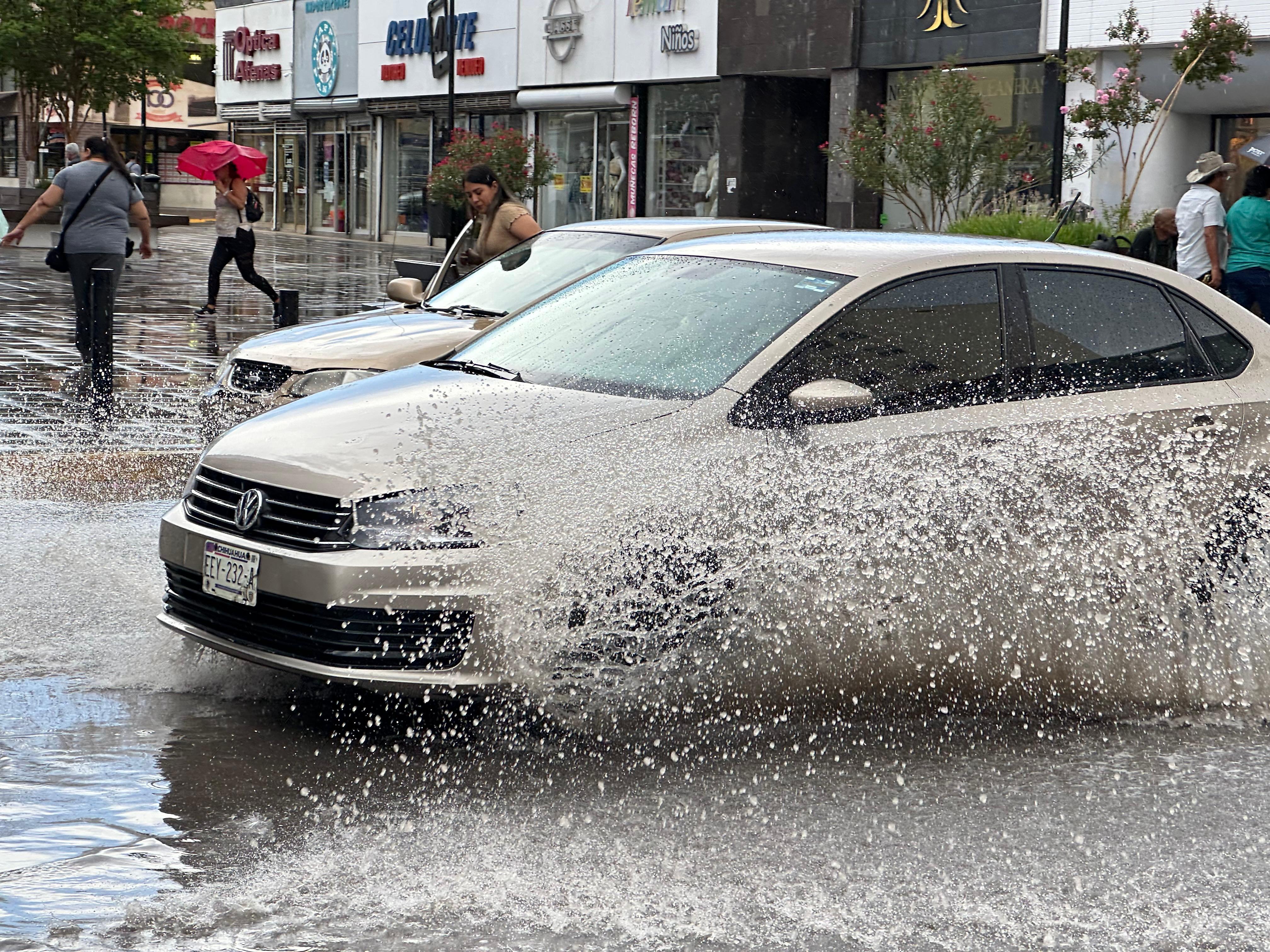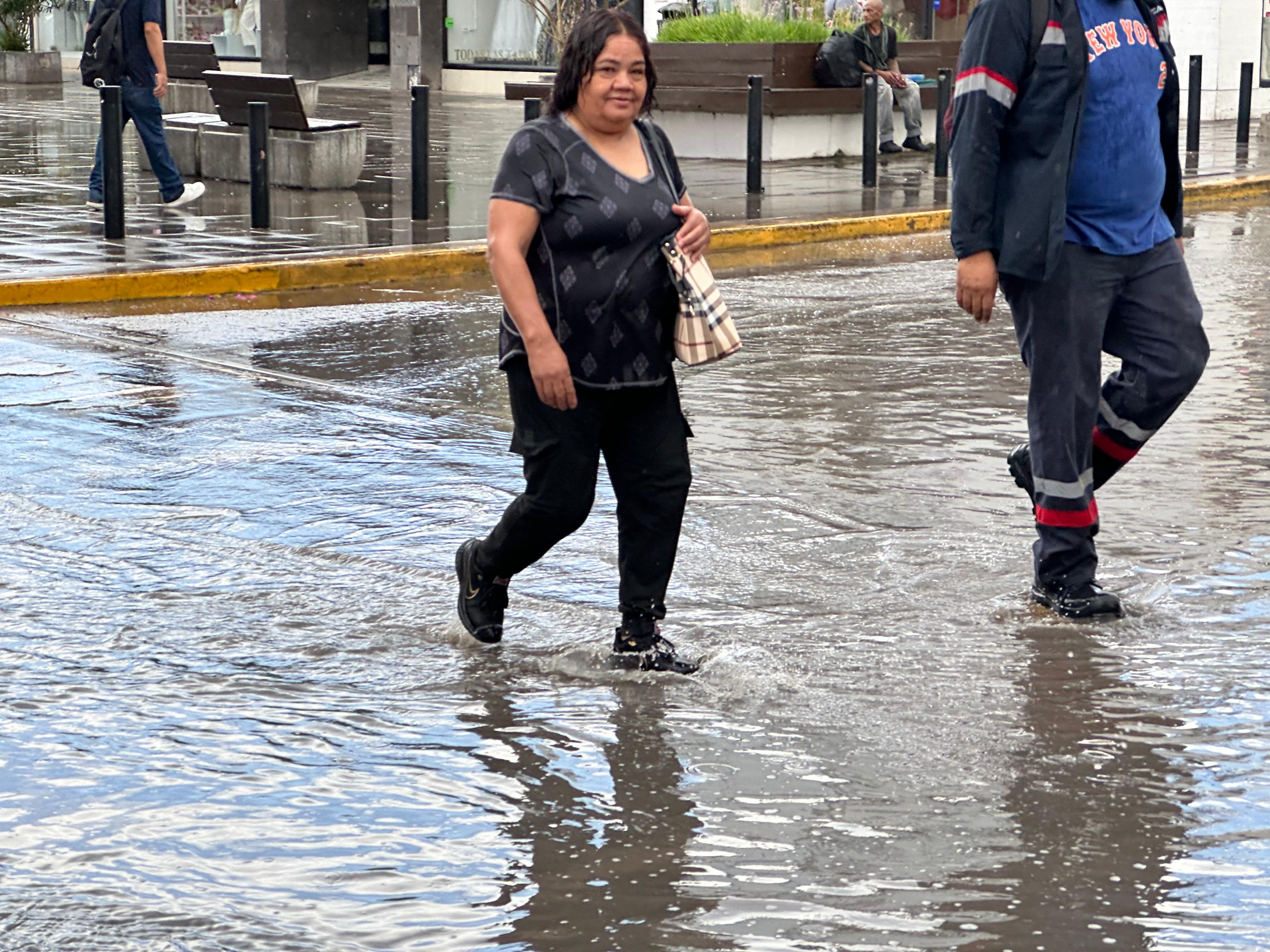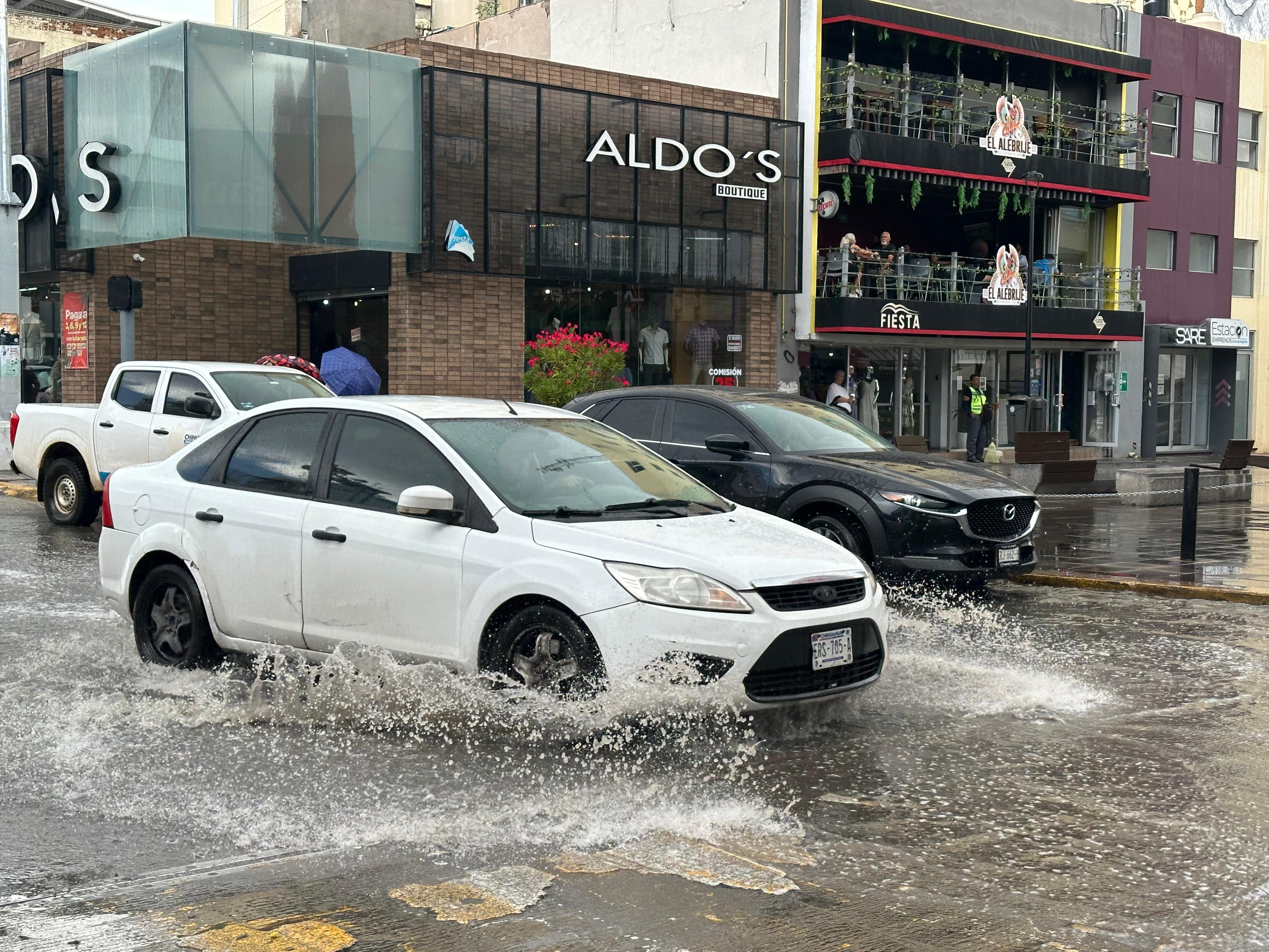 Chihuahua.- Acumulaciones de agua se han registrado en varias calles del centro de la ciudad como la Aldama y Juárez tras las lluvias registradas desde antes de las 2:00 de la tarde, tal y como lo marcó el pronóstico del tiempo para este día.