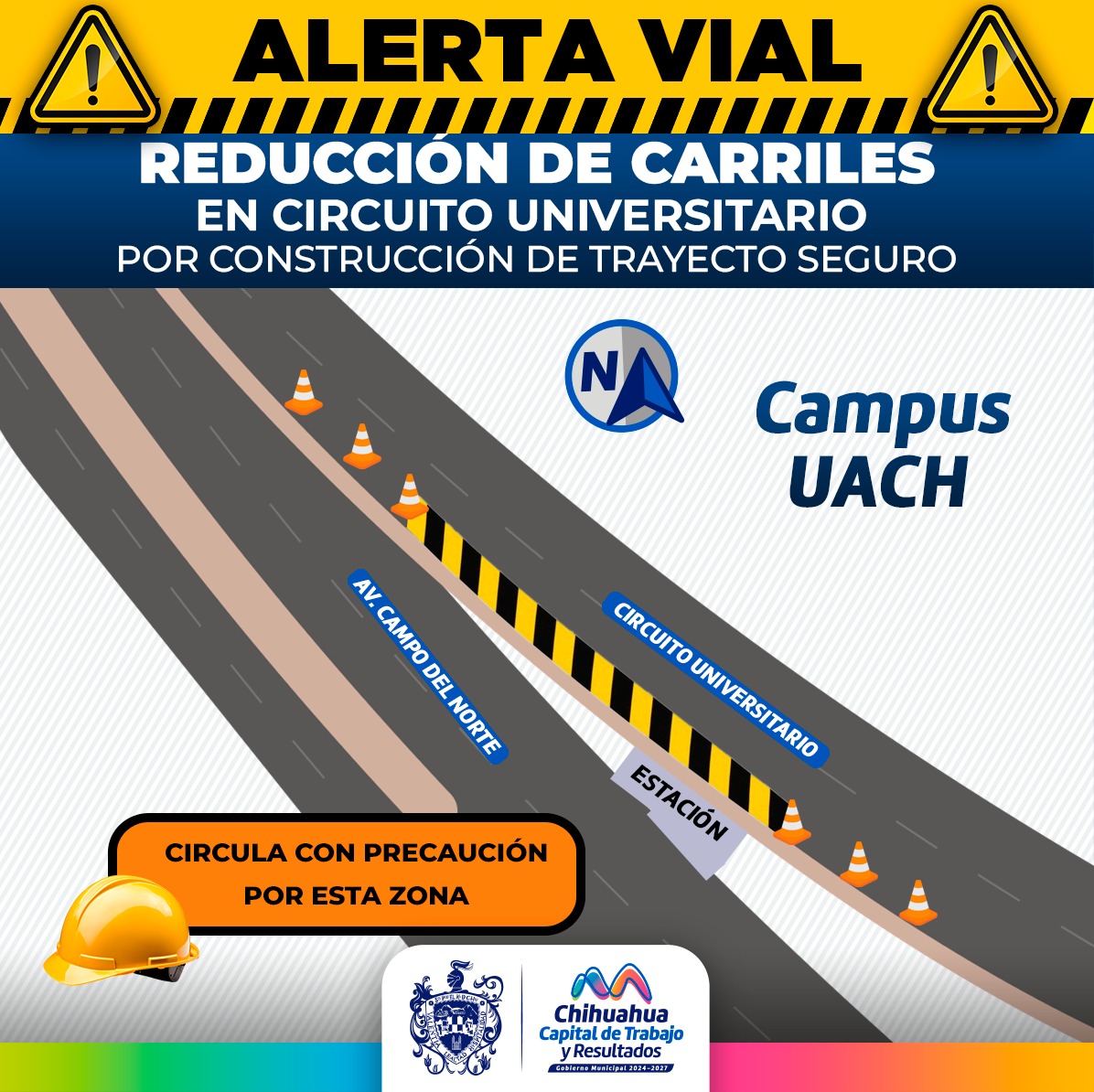 Chihuahua.- El Gobierno Municipal, a través de la Dirección de Obras Públicas, alerta por la reducción de carriles en el Circuito Universitario a la altura de la avenida Campo del Norte en el sentido norte-sur debido a los trabajos de construcción del trayecto seguro, proyecto ganador del Presupuesto Participativo.