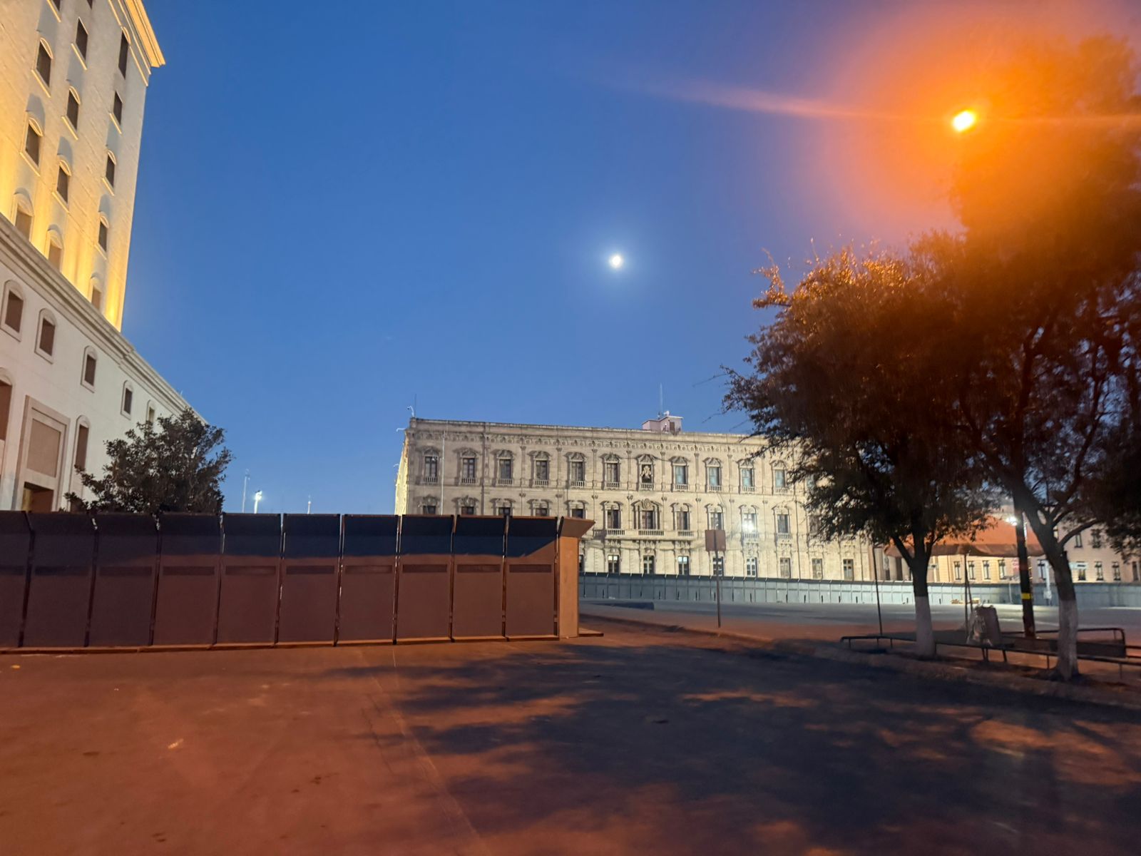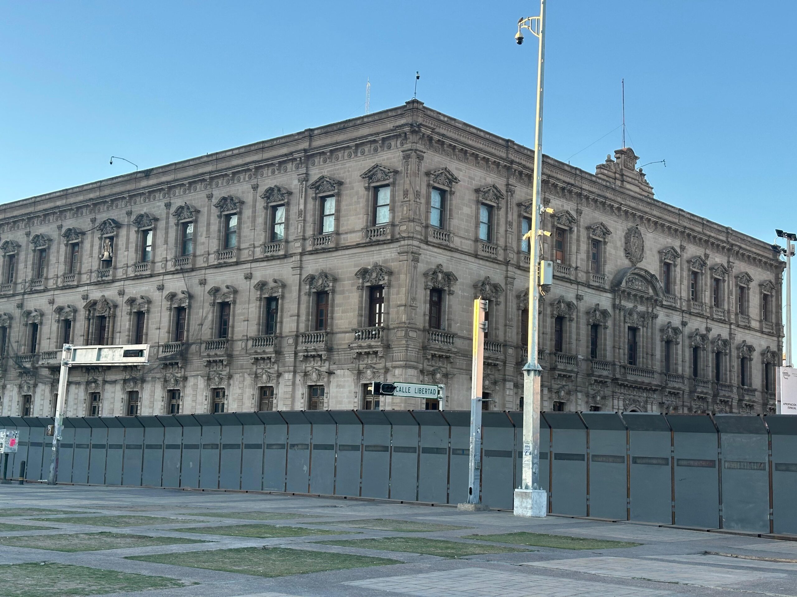 El primer inmueble en ser cercado fue el Palacio de Gobierno, sede del Poder Ejecutivo estatal, donde se colocaron estructuras de acero de más de dos metros de altura para restringir el acceso directo a la fachada y prevenir posibles daños o pintas durante las concentraciones.