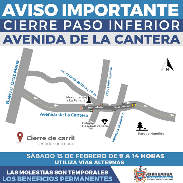 Por lo anterior el Gobierno Municipal recomienda tomar las precauciones necesarias para evitar el congestionamiento vial, tomando la parte superior de La Cantera, antes de tomar el paso inferior, en el sentido sur a norte.