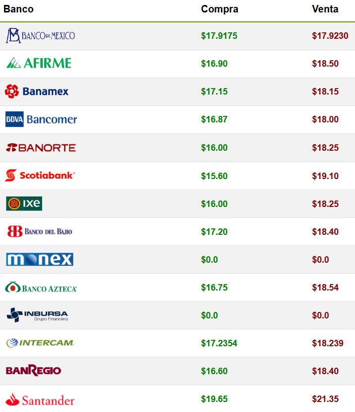 El tipo de cambio interbancario promedio para este lunes es de $17.4924 a la compra y $18.1466 a la venta, en el Banco de México $17.9175, en el Diario Oficial de la Federación (DOF) $17.8998, el Pago para Obligaciones $17.8117, el Servicio de Administración Tributaria (SAT) $17.8998 y Bank of América $17.0648 a la compra y $19.084 a la venta.
