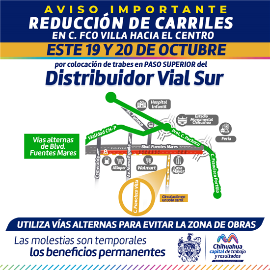 Chihuahua.- El miércoles 19 y jueves 20 de octubre, el Gobierno Municipal iniciará la instalación de las primeras 15 trabes de lo que será el paso superior del Distribuidor Vial Sur, de los tres claros que contará el puente, por lo que a partir de ese día la circulación vehicular de la calle Francisco Villa, desde la calle 24, se verá afectada.