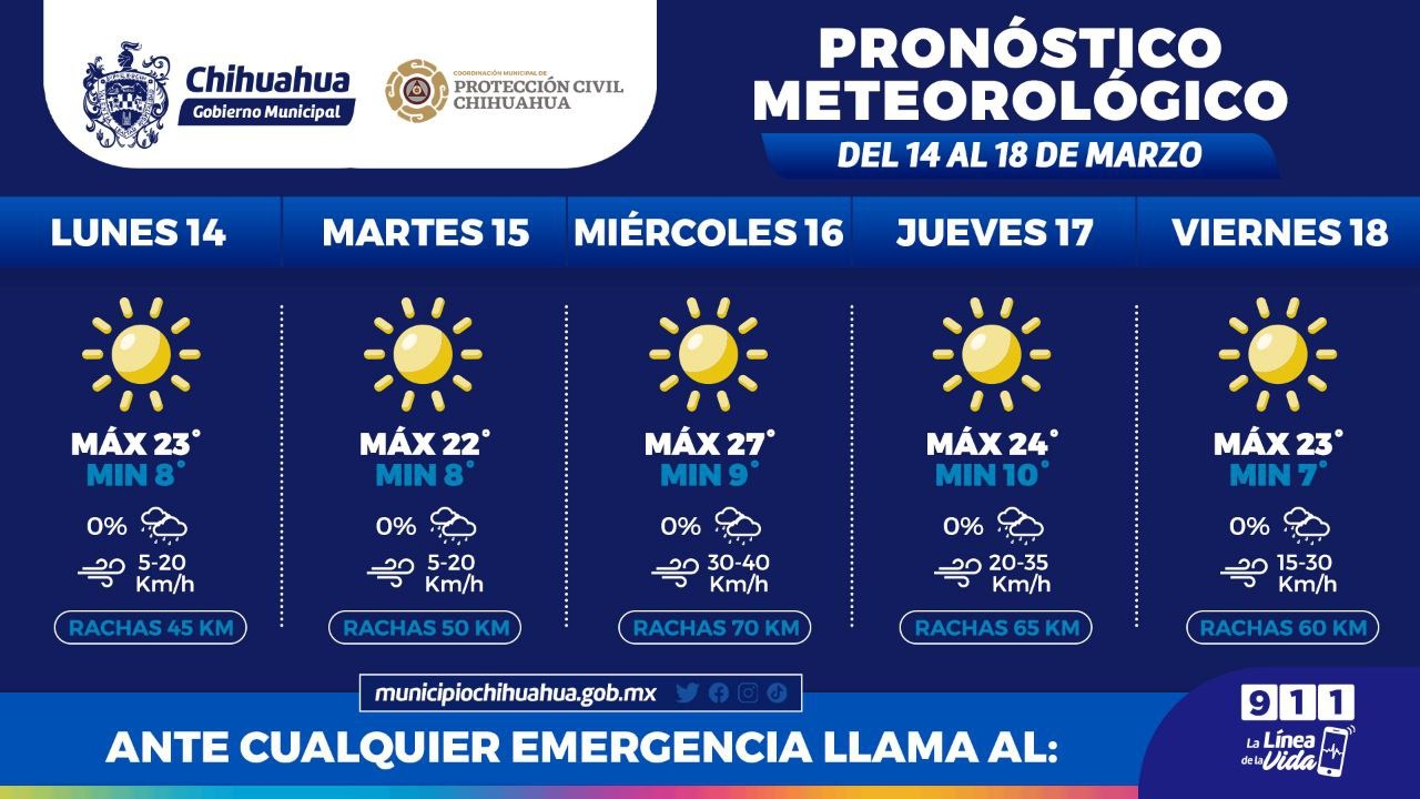 Leer másChihuahua, Chih.- La Coordinación Municipal de Protección Civil informa a la ciudadanía que esta semana podrían presentarse ráfagas de viento de hasta 60 kilómetros por hora en la ciudad, por lo que invita a la población a tomar precauciones por los fuertes vientos y a atender las recomendaciones que emiten las autoridades. De acuerdo al pronóstico que emite el Servicio Meteorológico Nacional de CONAGUA, se tendrán temperaturas agradables durante el día, ...