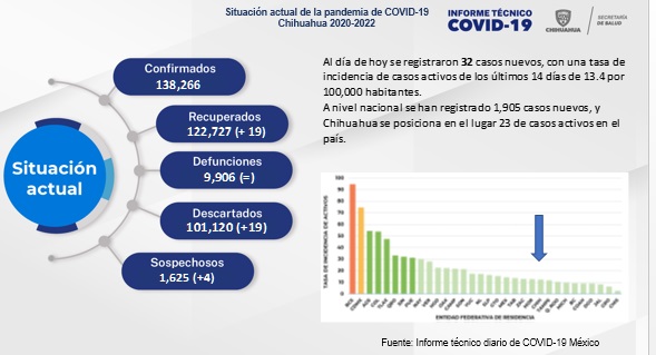 Leer másChihuahua.- El Gobierno del Estado dio a conocer que que se registraron 32 casos nuevos de Covid-19 en la entidad durante ayer domingo con lo que la cifra general de contagios se elevó a138 mil 266 personas contagias en lo que va de la pandemia. El registro de personas que han perdido la vida por COVID-19 se conserva con 9 mil 906, por lo cual no se suman nuevos fallecimientos. La cantidad ...