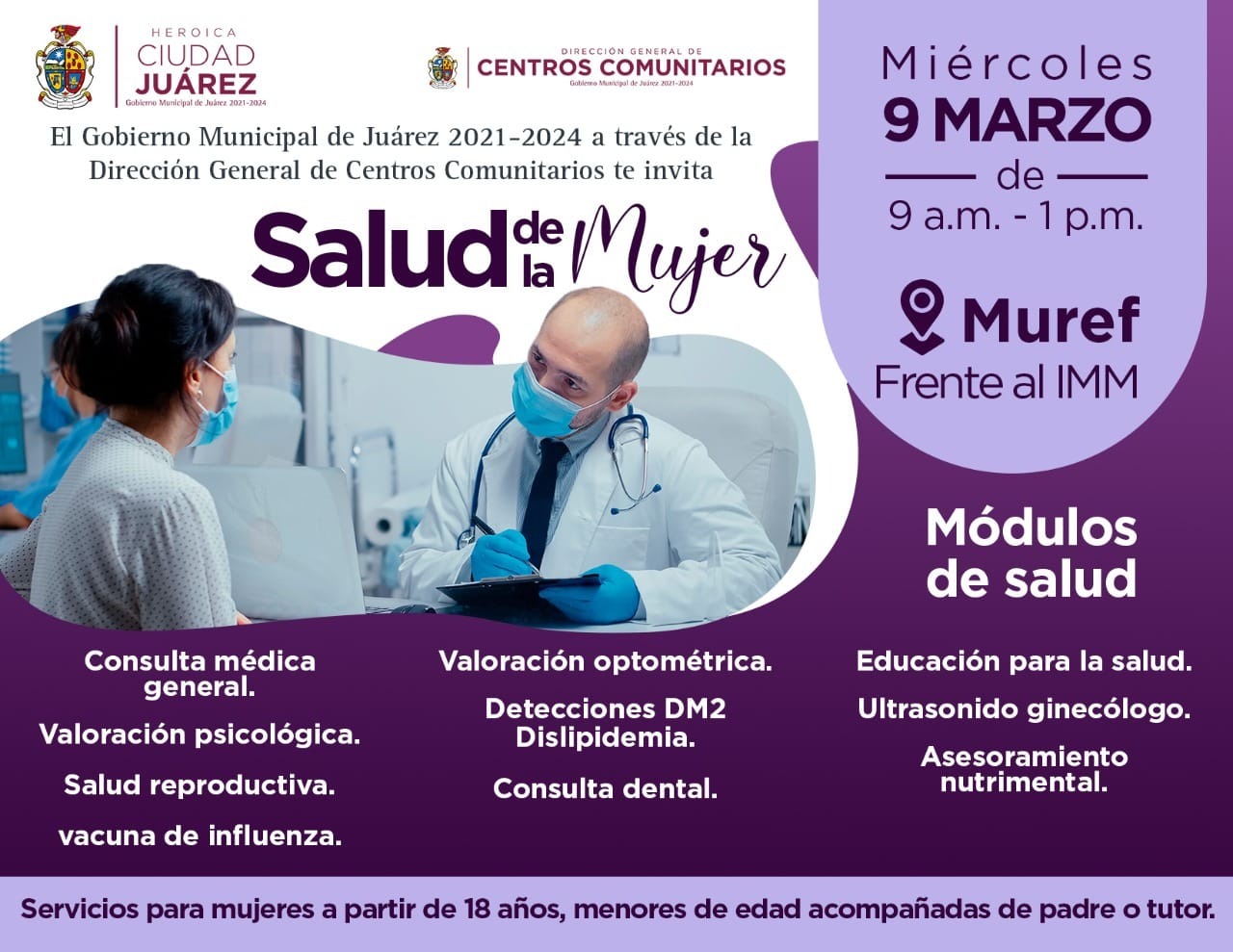Leer másJuárez.- Como parte de las diferentes acciones y actividades que lleva a cabo el Gobierno Municipal dentro del marco del Día Internacional de las Mujeres, la Dirección General de Centros Comunitarios llevará a cabo una feria de la Salud de la Mujer. El evento se desarrollará el 9 de marzo en el Museo de la Revolución en la Frontera (Muref), frente al Instituto Municipal de las Mujeres en la Zona Centro, ...