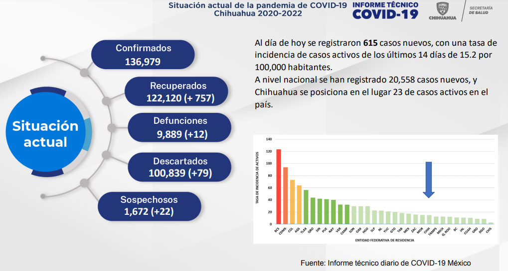 Leer másChihuahua.- En las ultimas 24 horas se registraron 615 casos confirmados de Covid-19, con el municipio de Chihuahua con el mayor numero de contagios, además de 12 defunciones por la enfermedad en diferentes municipios de la entidad, de acuerdo con la Secretaría de Salud. La dependencia indicó que las cifras totales en lo que va de la pandemia son 122 mil 120 (+757) recuperados, 100 mil 839 (+79) descartados y mil ...