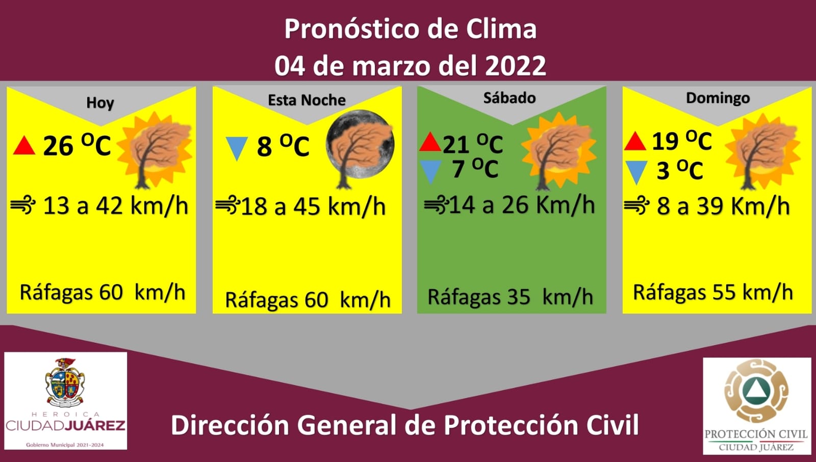 Leer másJuárez-. La Dirección de Protección Civil municipal, con base en informes del Sistema Meteorológico Nacional, emite una alerta amarilla para este viernes, debido a ráfagas de viento que alcanzarán hasta los 60 kilómetros por hora, los cuales se presentarán a partir de las 10:00 de la mañana. Roberto Briones Mota, titular de la dependencia, dijo que para hoy se espera una temperatura máxima de 26 °C, mientras que la mínima será ...