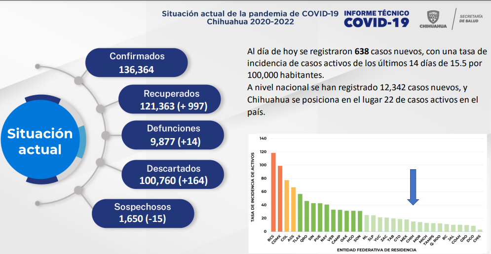 Leer másChihuahua.- El Gobierno del Estado, a través de la Secretaría de Salud de Chihuahua, dio a conocer que se registraron 638 casos nuevos de Covid-19, con lo que la cifra de contagios se eleva a los 136 mil 364 en lo que va de la pandemia. Este jueves un total de 55 personas se encuentran hospitalizadas, de las cuales 42 están en áreas generales destinadas para COVID-19 que corresponde al 22.22 ...