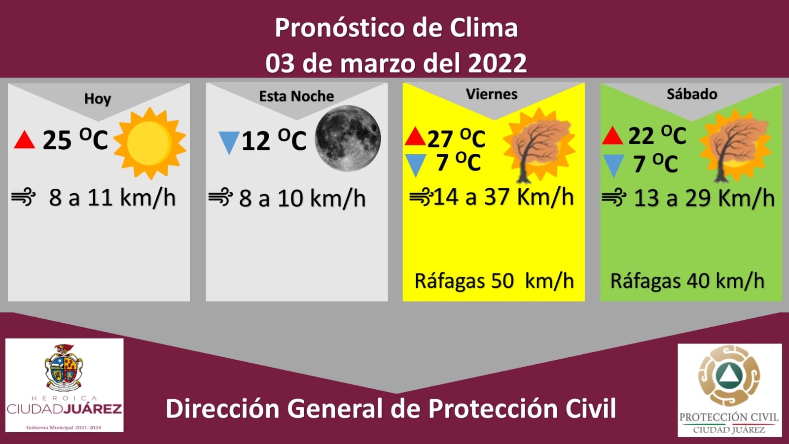 Leer másJuárez.- La Dirección de Protección Civil municipal, con base en informes del Sistema Meteorológico Nacional, pronostica un jueves parcialmente nublado con una temperatura máxima de 25 grados centígrados, dio a conocer Roberto Briones Mota, titular de la dependencia. Para hoy, la temperatura mínima será de 12 grados centígrados, en tanto que la velocidad del viento se espera de 8 a 11 kilómetros por hora, con una humedad del 23 por ciento. Existe ...