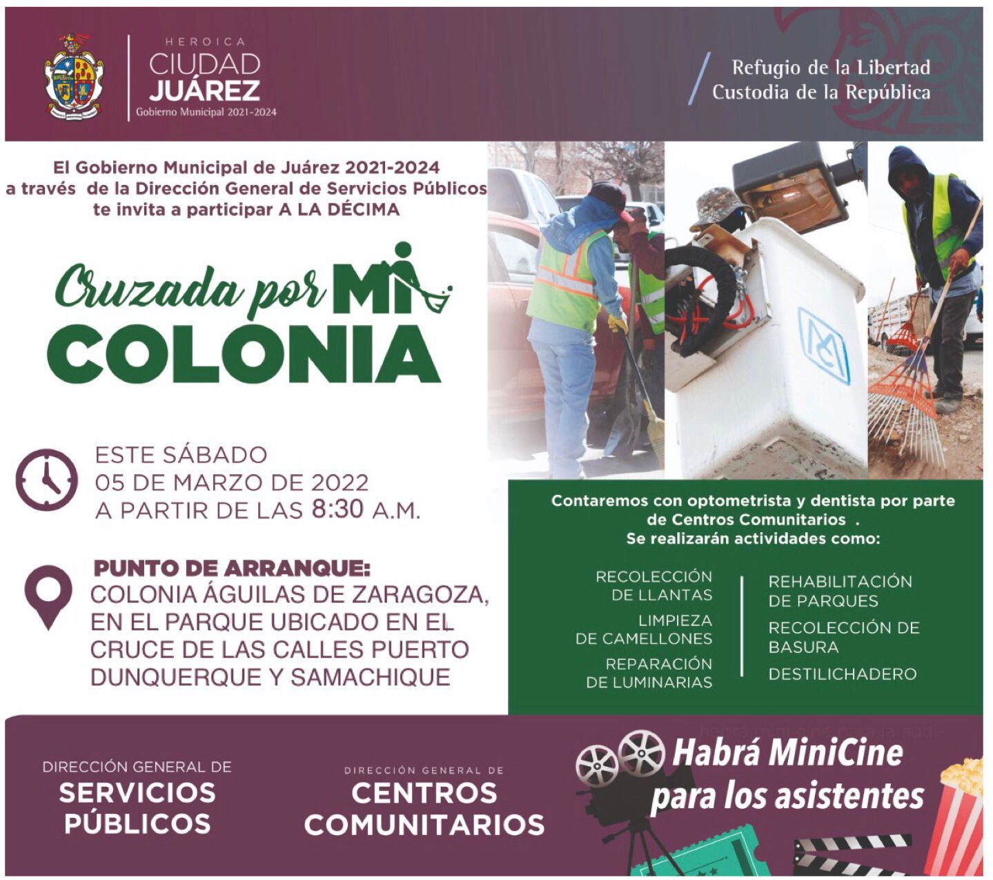 Leer másJuárez.- Personal de la Dirección de Servicios Públicos Municipales llevará a cabo el próximo sábado 5 de marzo la décima “Cruzada por mi Colonia” en el área de Águilas de Zaragoza. El punto de arranque será en el parque ubicado en el cruce de las calles Puerto Dunquerque y Samachique a partir de las 8:30 de la mañana, en donde cuadrillas de las dependencias pertenecientes a Servicios Públicos ya se encuentran ...