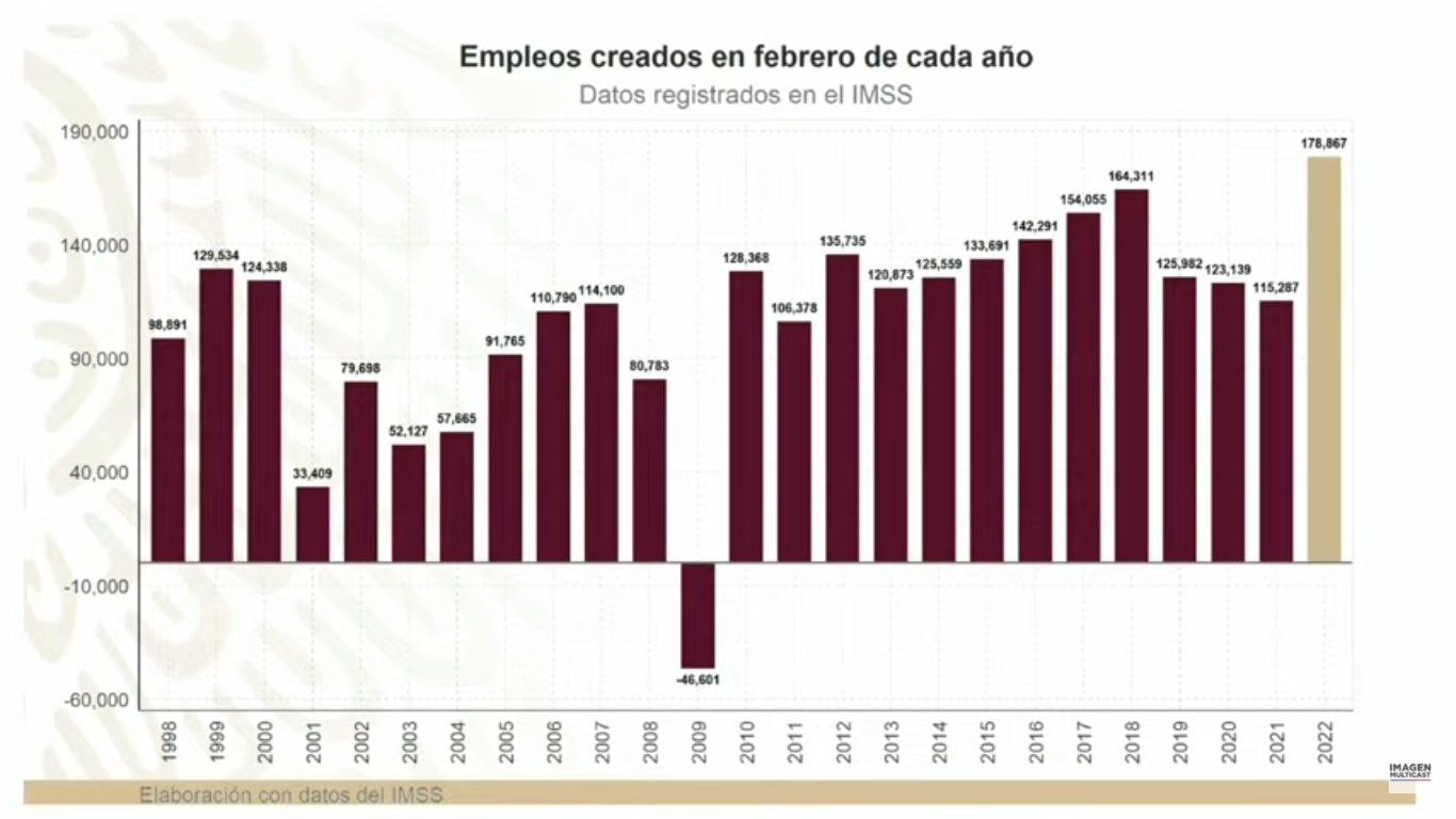 Leer másMéxico.- La creación de empleos por parte del sector privado alcanzó un nivel histórico al registrar 20.9 millones de trabajadores en el Instituto Mexicano del Seguro Social (IMSS), explicó Carlos Torres Rosas, coordinador general de Programas de Bienestar. Durante la conferencia matutina de presidente Andrés Manuel López Obrador esta mañana, Torre Rosas indicó que en el mes de febrero el país registró 178 mil 867 trabajadores ante el IMSS, una cifra ...