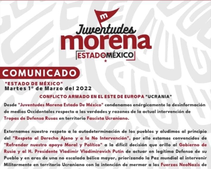 Leer másMéxico.- Juventudes Morena Estado de México, grupo militante del partido Movimiento de Regeneración Nacional, extendió un comunicado en que refrendó su apoyo moral y político al gobierno de Rusia ante su invasión a Ucrania, apoyo que rechazó el propio partido. A través de redes sociales, el grupo militante de jóvenes de Morena publicó un comunicado en el que envían su apoyo a la " difícil decisión que orilló al gobierno de ...