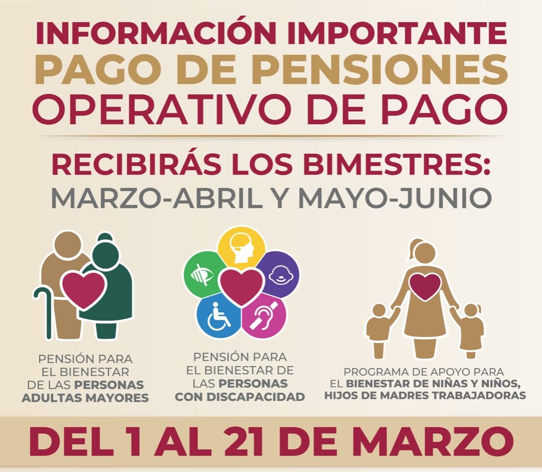 Leer másMéxico.- Entre el 1 y el 21 de marzo derechohabientes de las Pensiones para el Bienestar de las Personas Adultas Mayores y para Personas con Discapacidad Permanente, así como del Programa de Apoyo para el Bienestar de Niños y Niñas, Hijos de Madres Trabajadoras, en todo el país, recibirán el pago de marzo-abril, así como el adelanto de mayo-junio de manera ágil y ordenada. Con este pago, las personas Adultas Mayores ...