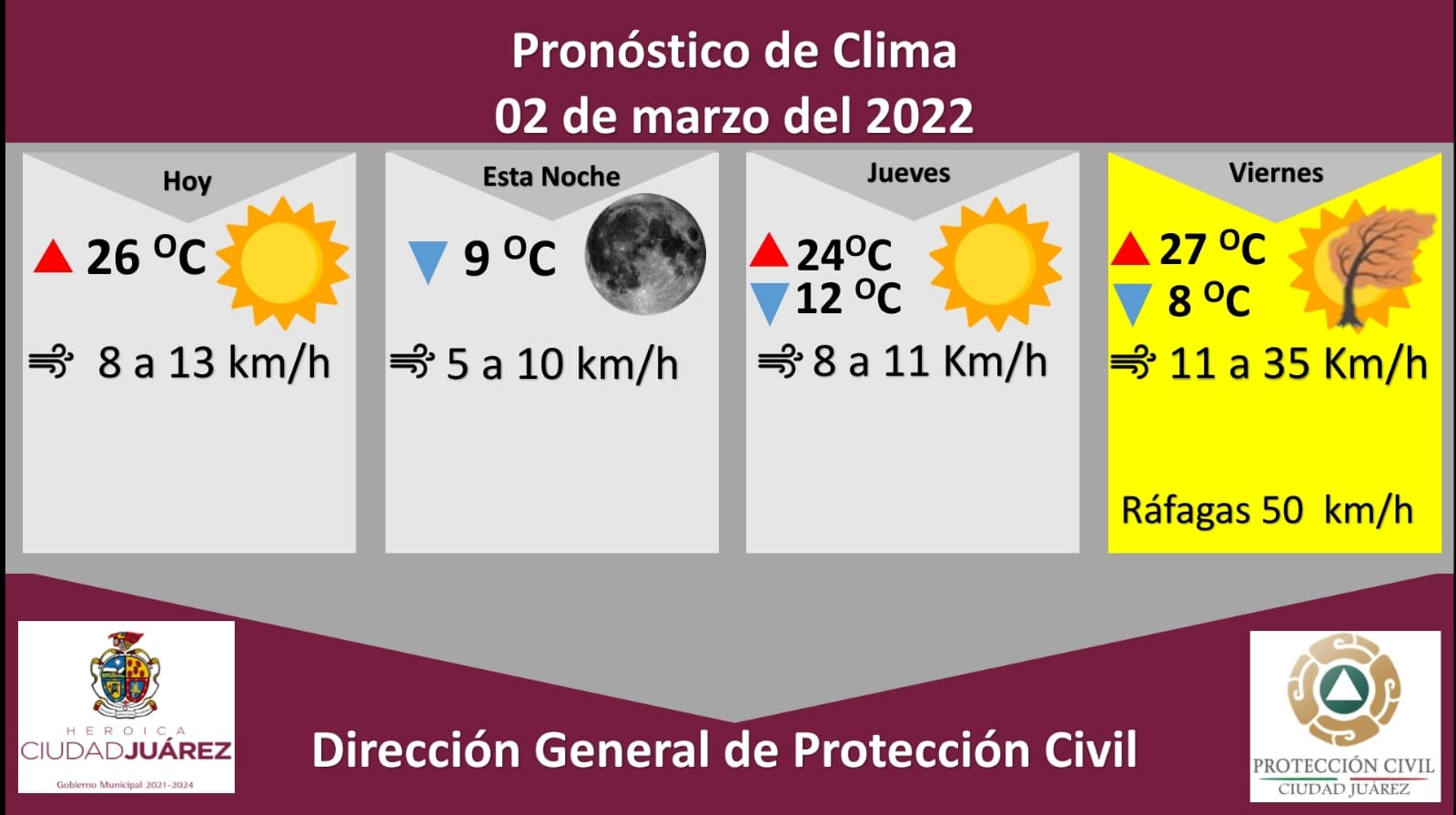 Leer másCiudad Juárez.- La Dirección de Protección Civil municipal, con base en informes del Sistema Meteorológico Nacional, pronostica un día mayormente soleado y una temperatura máxima de 26 grados centígrados para este martes. Roberto Briones Mota, titular de la dependencia mencionó que para hoy se espera una temperatura mínima de 9 grados centígrados, con vientos que oscilarán de 5 a 13 kilómetros por hora, además de una humedad del 23 por ciento. Para ...