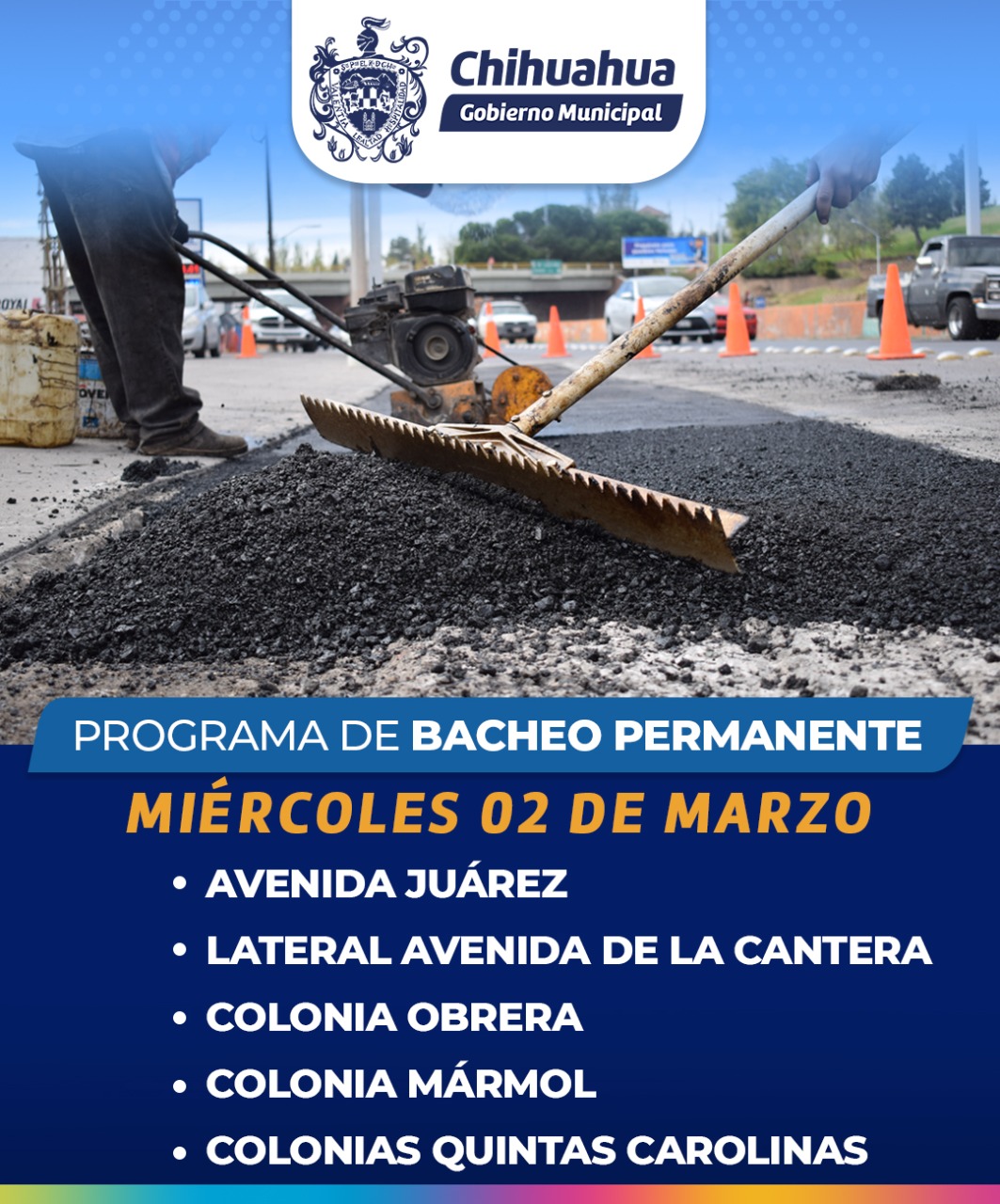 Leer másChihuahua.- El Gobierno Municipal, pide tomar precauciones a los conductores por los trabajos de bacheo que realizará hoy en diferentes avenidas y calles de la ciudad, a fin de evitar contratiempos. Se exhorta a la ciudadanía a tener cautela si transitan por las siguientes zonas de trabajo: • Avenida Juárez. • Lateral avenida de la Cantera. • Colonia Obrera. • Colonia Mármol. • Colonia Quintas Carolinas. Estas labores se realizarán en diferentes tramos en un horario de ...