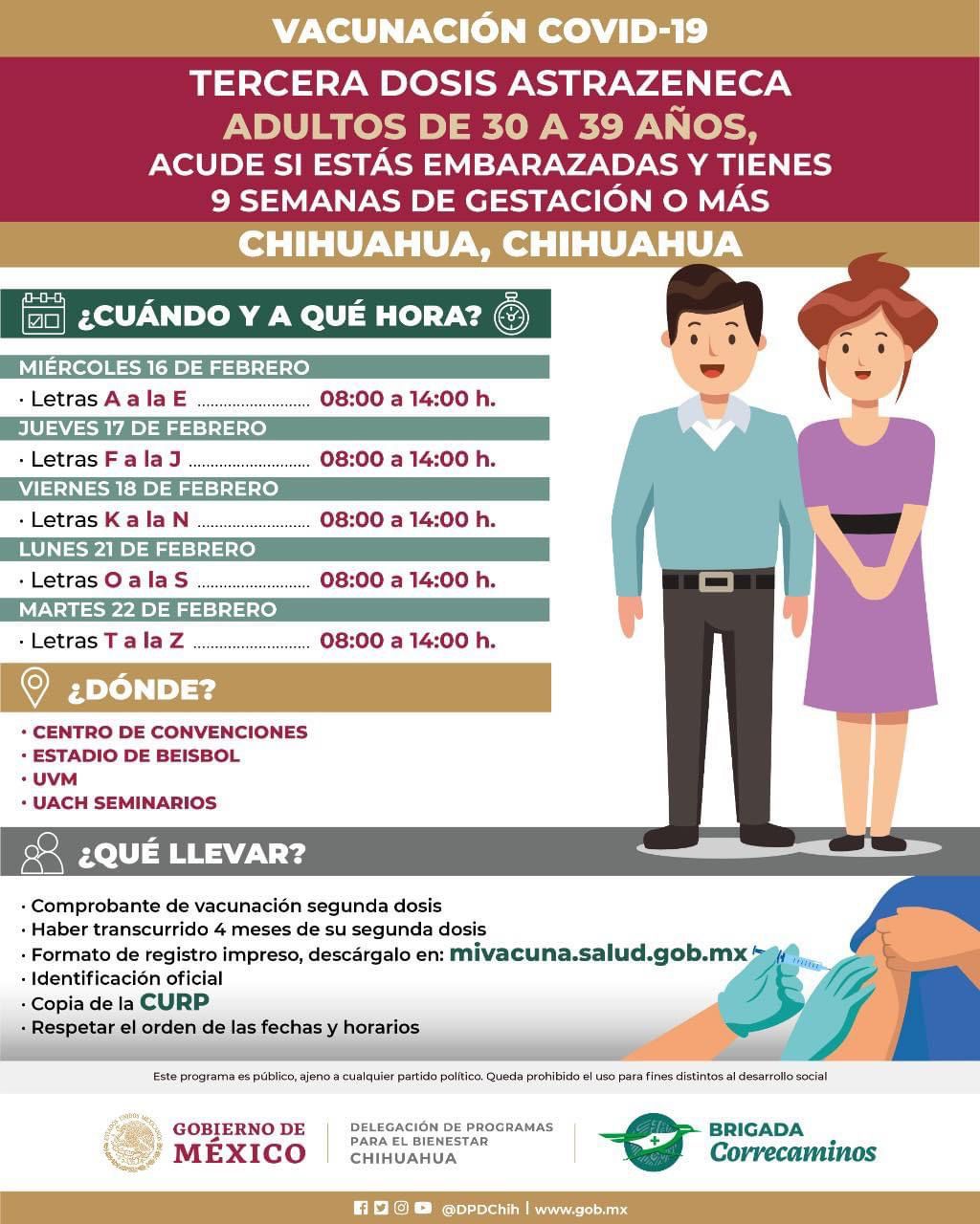 Leer másChihuahua.- Mañana martes 22 de febrero es el último día de aplicación de la tercera dosis para adultos de 30 a 39 años de edad en la ciudad de Chihuahua, dio a conocer la Delegación del Bienestar. De acuerdo con la calendarización de vacunación, hoy lunes 21 de febrero se estará aplicando la vacuna AstraZeneca a ciudadanos de 30 a 39 años de edad cuyo apellido paterno inicie con la letra ...