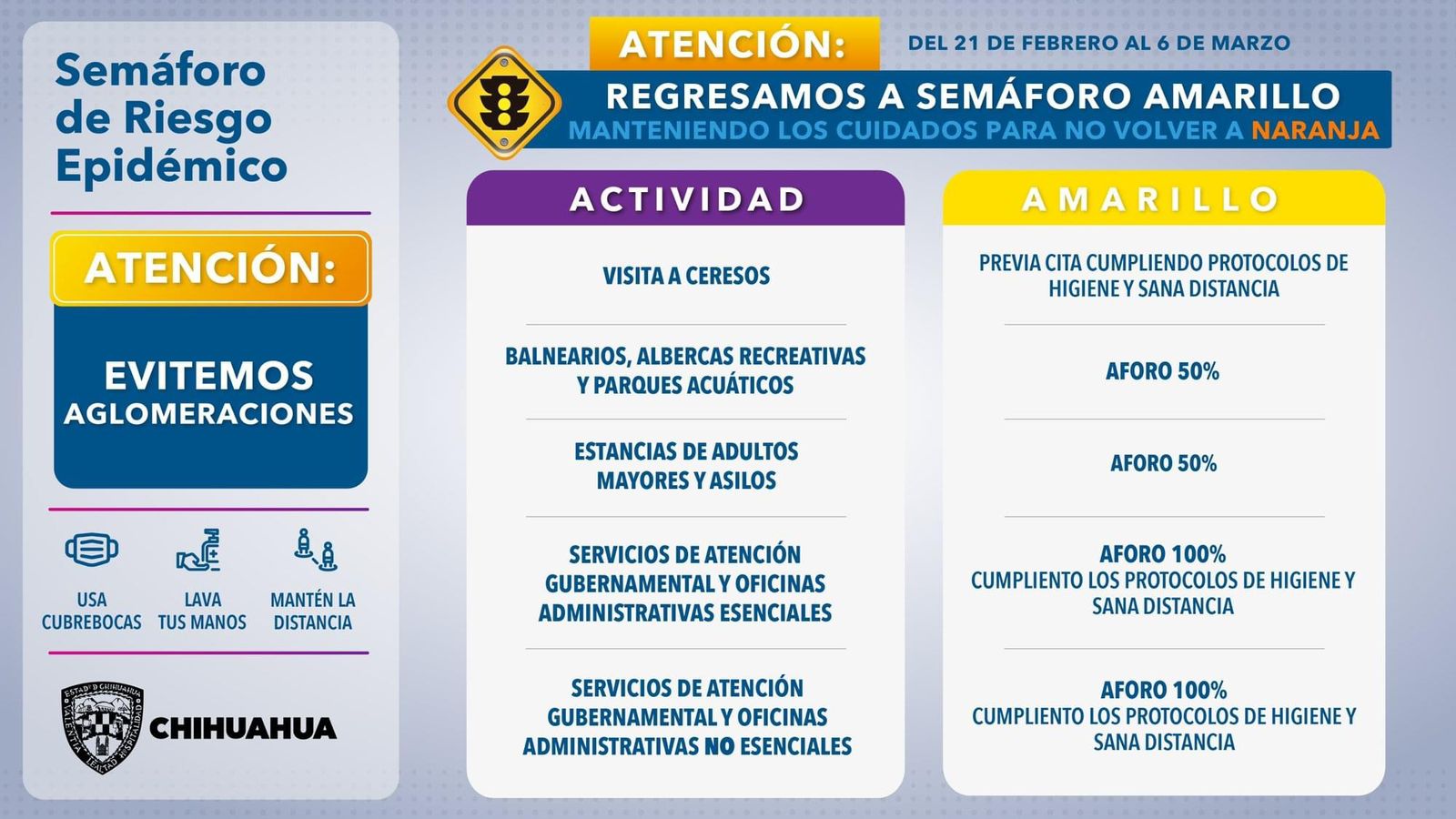 Leer másHoy lunes 21 de febrero la entidad de Chihuahua avanzó al color amarillo en el semáforo epidemiológico, ante la baja de contagios de Covid-19, por lo que se incrementarán los aforos en los comercios y se reanudan las visitas a las asilos. El Gobierno del Estado dio a conocer que los restaruantes, bares, centros nocturnos, establecimientos culturales y de entretenimiento incrementarán su aforo a partir de hoy lunes y hasta nuevo ...