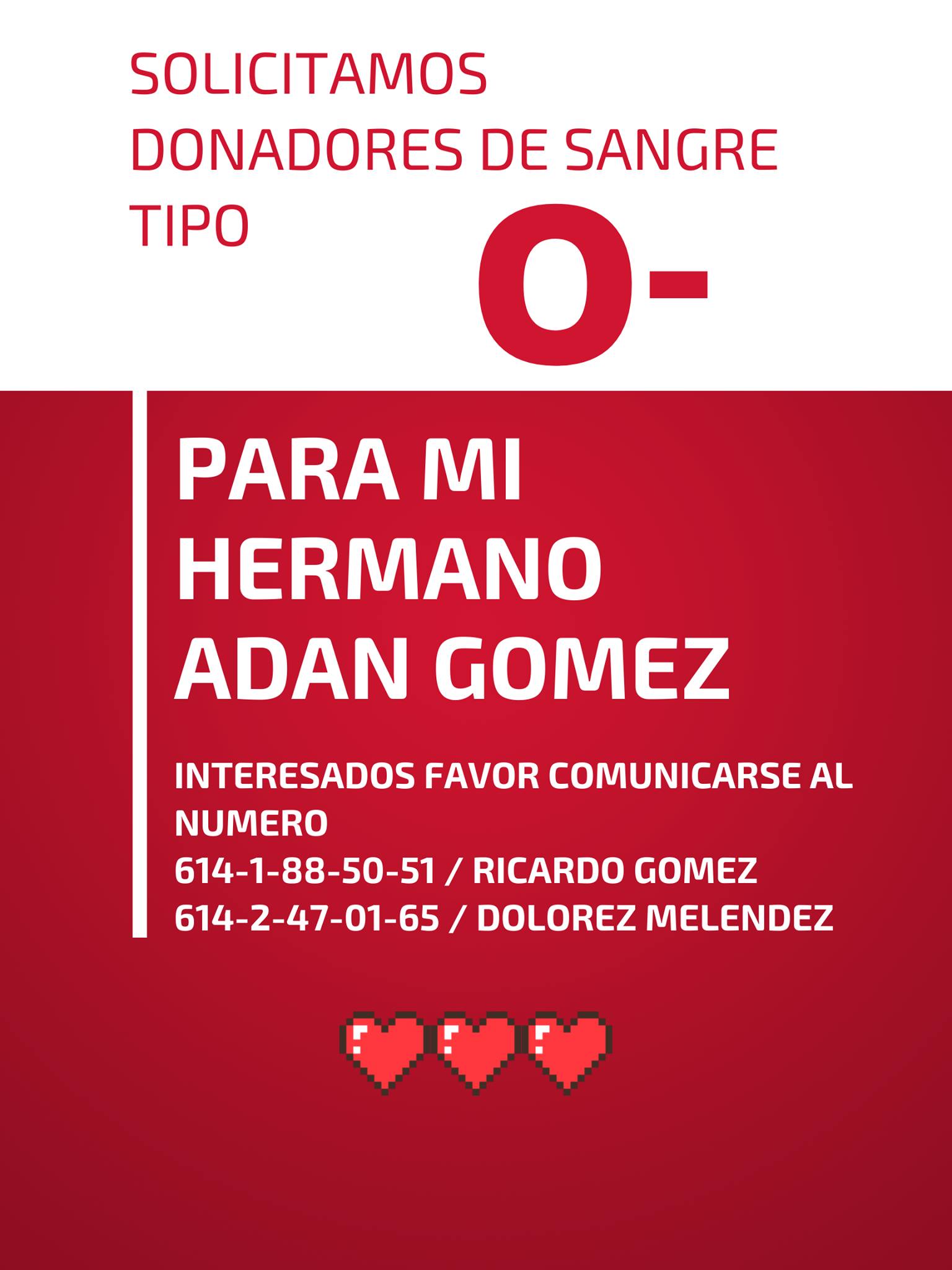 Leer másChihuahua.- Familiares del joven chihuahuense Adán Gómez piden la colaboración de la sociedad chihuahuense con la donación de sangre tipo O negativo (O-) ya que desde hace un mes se encuentra hospitalizado por quemaduras graves en gran parte de su cuerpo. El joven, quien se encuentra hospitalizado desde el 5 de octubre en un hospital del IMSS en Apodaca, Nuevo León requiere transfusiones de este tipo específico de sangre por lo ...
