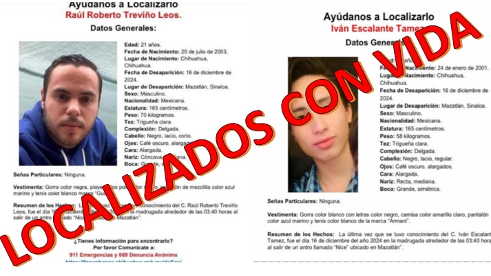 Leer másChihuahua.- Lariza Leos, tía de Raúl Roberto Treviño Leos, confirmó la localización con vida de su sobrino, así como de Iván Escalante Támez, ambos jóvenes chihuahuenses desparecidos en Mazatlán. A través de redes sociales agradeció el apoyo de los chihuahuenses, a quienes compartieron las diferentes pesquisas, mandaron muestras de empatía y de alguna manera se mostraron solidarios con las familias. “No tenemos palabras para agradecer a la infinidad de personas que ...