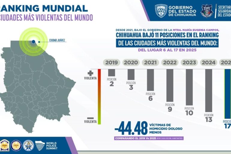 Chihuahua.- Desde el año 2021, fecha en que la Mtra. María Eugenia Campos Galván tomó posesión del Gobierno del Estado de Chihuahua, se ha logrado bajar 11 posiciones de las ciudades más violentas del mundo, pasando del lugar número 6 a la posición número 17 en el 2025. Lo anterior de acuerdo al estudio elaborado por la ONG “Seguridad, Justicia y Paz: Consejo Ciudadano para la Seguridad Pública y la Justicia Penal ...
