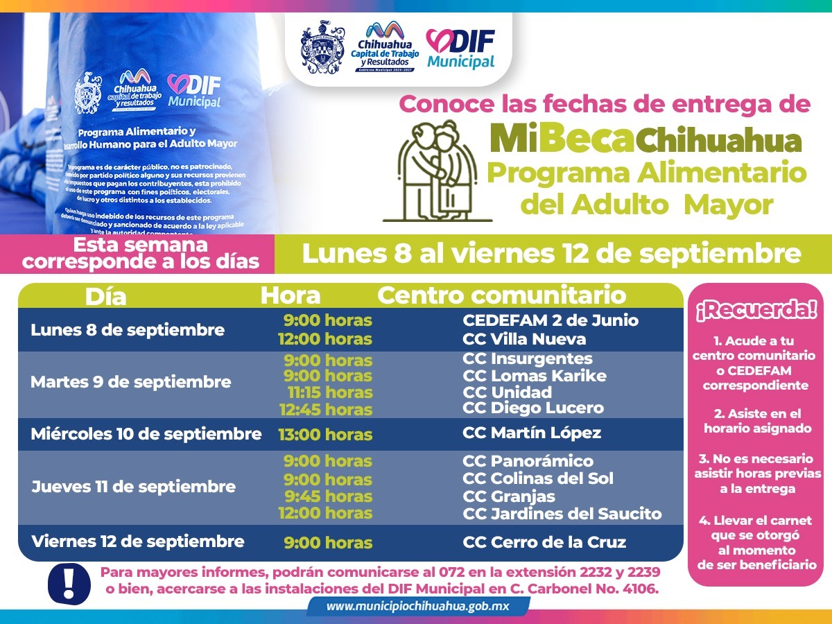 Leer másChihuahua.- En atención al compromiso que el Gobierno Municipal tiene con las y los adultos mayores de Chihuahua Capital, para garantizarles una mejor calidad de vida, a través del DIF, se informa a las y los solicitantes del Programa Alimentario del Adulto Mayor (PAAM) que podrán acudir por su paquete alimentario, del 8 al 12 de septiembre: 8 de septiembre: * CEDEFAM 2 de Junio, 9:00 horas * Villa Nueva, 12:00 horas 9 de ...