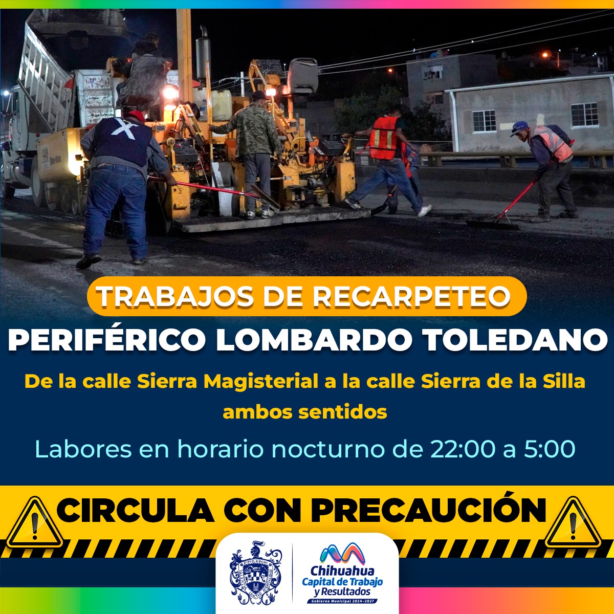 Leer másChihuahua.- El Gobierno Municipal, a través de la Dirección de Obras Públicas, emite una alerta vial por los próximos trabajos de recarpeteo en el tramo del periférico Lombardo Toledano que abarca de la calle Sierra Magisterial a la calle Sierra de la Silla en ambos sentidos por lo que se exhorta a la ciudadanía a circular con precaución por la zona. Con una inversión mayor a los 11 millones de pesos, ...