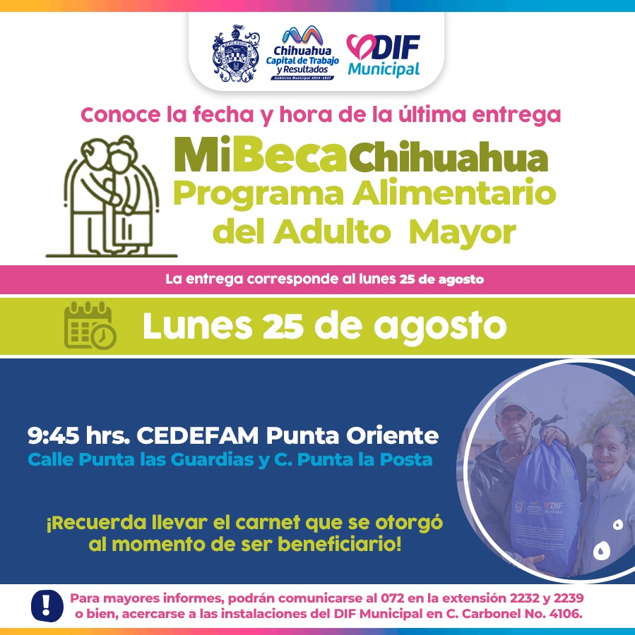 Leer másChihuahua.- En atención al compromiso que el Gobierno Municipal tiene con las y los adultos mayores de Chihuahua Capital, para garantizarles una mejor calidad de vida, a través del DIF, se informa a las y los solicitantes del Programa Alimentario del Adulto Mayor (PAAM) que podrán acudir por su paquete alimentario este lunes 25 de agosto, en el CEDEFAM Punta Oriente, a las 9:00 am. Las y los adultos mayores deberán ...
