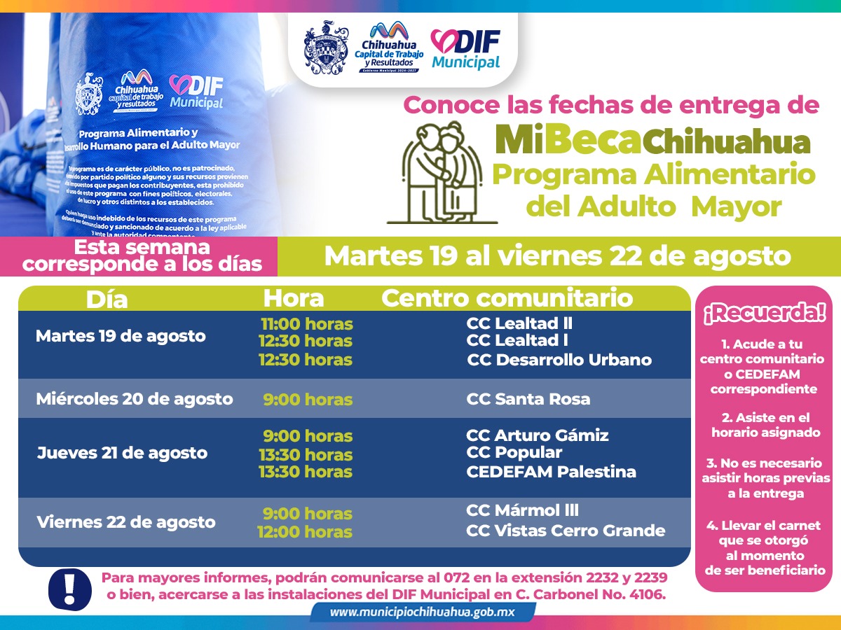 Leer másChihuahua.- El DIF Municipal informa a las y los beneficiarios del Programa Alimentario del Adulto Mayor (PAAM) los centros comunitarios y horarios en los que podrán acudir por su paquete alimentario del 19 al 22 de agosto: 19 agosto: * Lealtad II, 11:00 horas * Lealtad I, 12:30 horas * Desarrollo Urbano, 12:30 horas 20 agosto: * Santa Rosa, 9:00 horas 21 agosto: * Arturo Gámiz, 9:00 horas * Popular, 13:30 horas * CEDEFAM Palestina, 13:30 horas 22 agosto: * Mármol III, ...