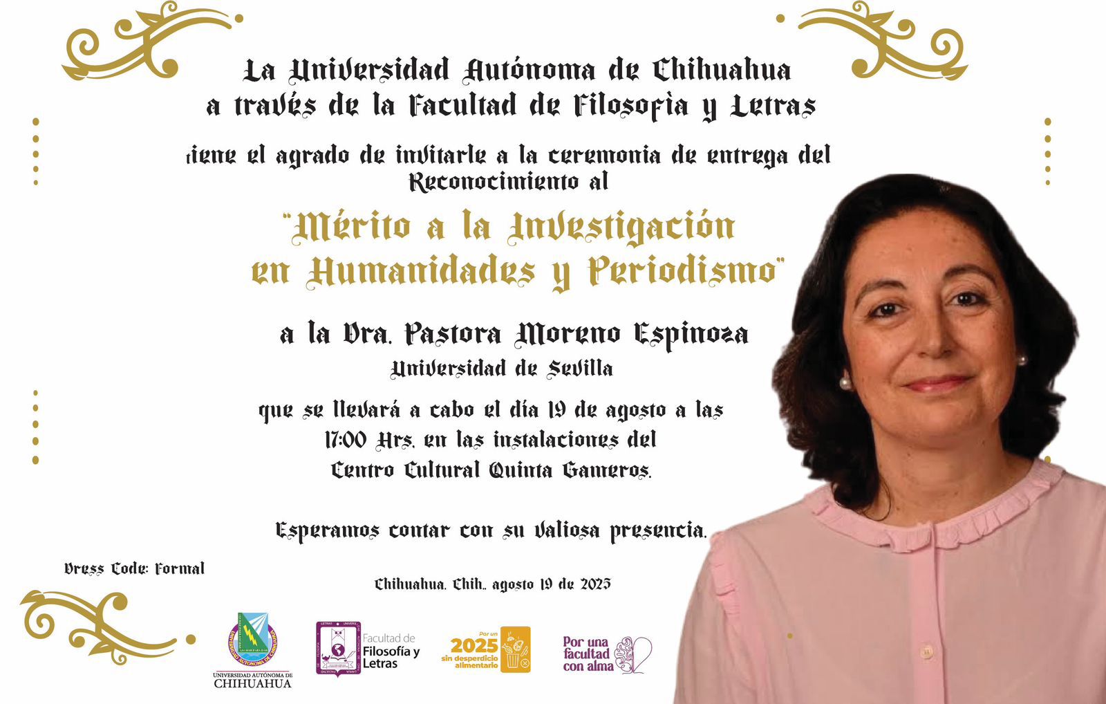 Leer másChihuahua.- La Universidad Autónoma de Chihuahua, a través de la Facultad de Filosofía y Letras, entregará el próximo martes 19 de agosto a las 17:00 horas en el Centro Cultural Quinta Gameros, el Reconocimiento al “Mérito a la Investigación en Humanidades y Periodismo” a la Dra. Pastora Moreno Espinoza, académica de la Universidad de Sevilla y referente internacional en el campo del periodismo y la comunicación. Primera mujer en obtener el ...