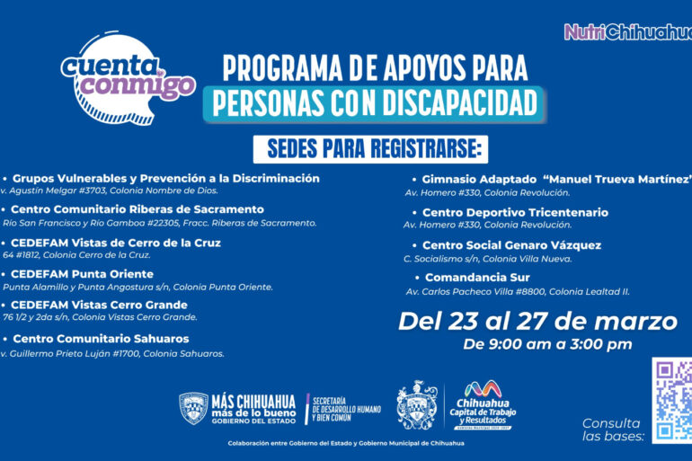 Leer másChihuahua.- Con el objetivo de contribuir al desarrollo de personas con discapacidad permanente, el Gobierno del Estado y el Municipio de Chihuahua anunciaron de manera conjunta la convocatoria para el programa “Apoyo Económico a Personas con Discapacidad 2026”. El secretario de Desarrollo Humano y Bien Común, Rafael Loera, informó que el programa contempla un apoyo económico de hasta los 13 mil pesos, conforme a un estudio socioeconómico, con el fin de ...
