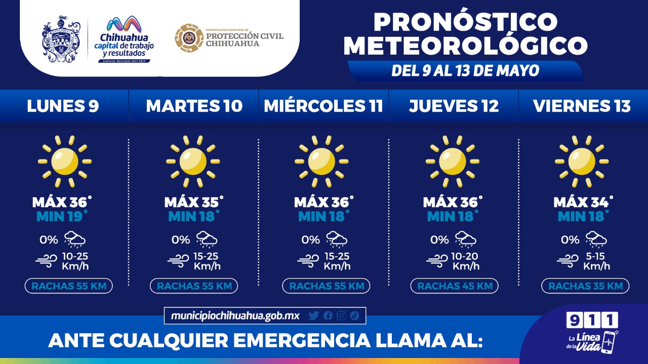 Leer másLa Coordinación Municipal de Protección Civil, informa que durante la semana se tendrán días calurosos por lo que es importante no permanecer por tiempos prolongados bajo los rayos del sol, a fin de prevenir deshidrataciones u otras complicaciones de salud, así mismo se informa que no se esperan precipitaciones. De acuerdo al pronóstico que emite el Servicio Meteorológico Nacional de CONAGUA, para este lunes se espera una máxima de 36°C y ...