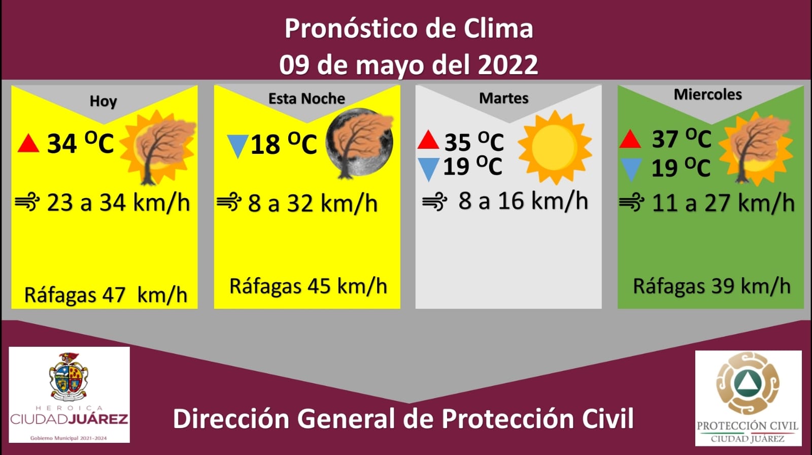 Leer másJuarez.- La Dirección de Protección Civil municipal, con base en informes del Servicio Meteorológico Nacional, emite una alerta amarilla para este lunes debido a ráfagas de viento que alcanzarán los 47 kilómetros por hora, dio a conocer Roberto Briones Mota titular de la dependencia. Para hoy se espera una temperatura máxima de 34 °C, mientras que la mínima será de 18 °C, la velocidad del viento oscilará de 8 a 34 ...