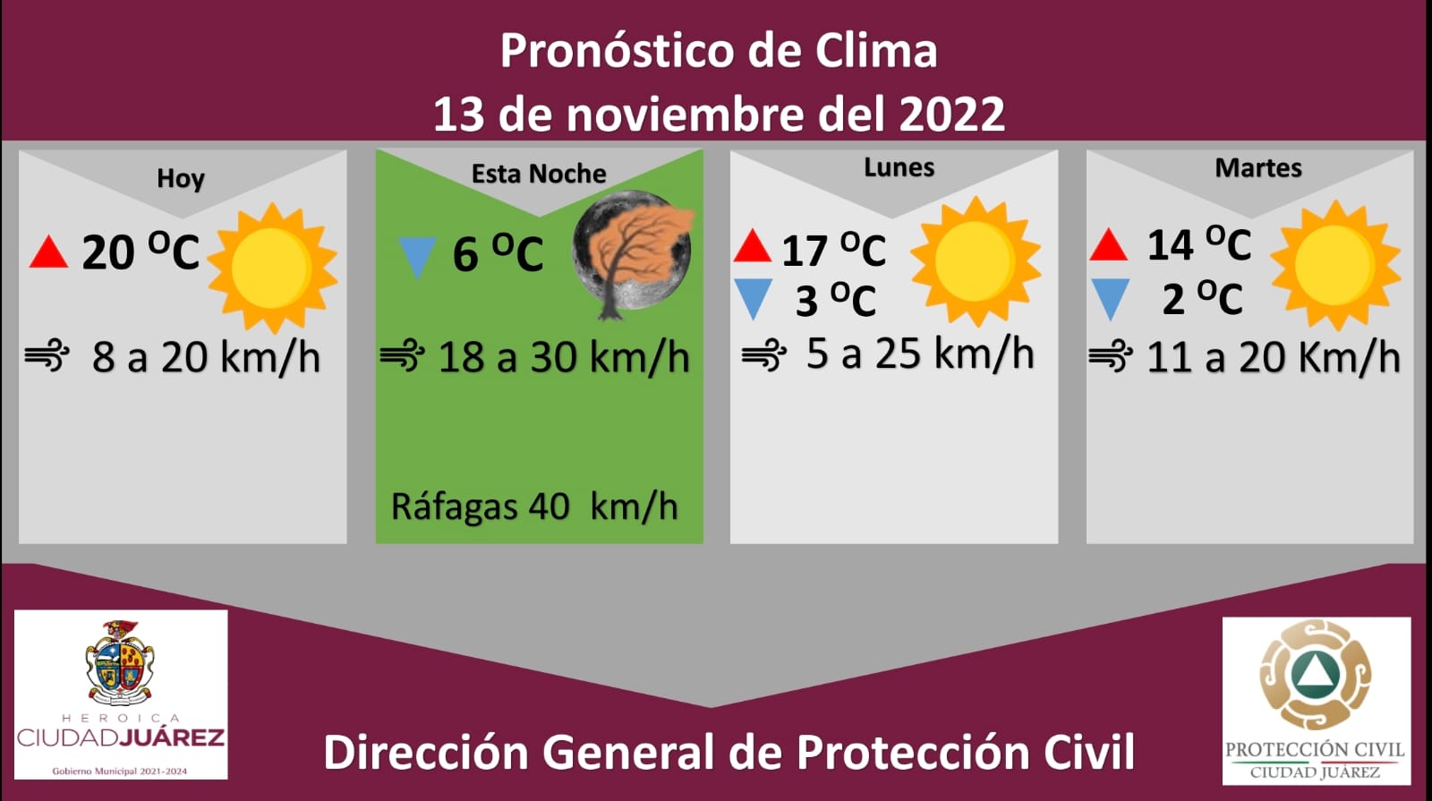 Leer másJuárez.- La Dirección General de Protección Civil, con base en informes del Servicio Meteorológico Nacional, emite una alerta verde para este domingo debido a ráfagas de viento que podrían alcanzar los 40 kilómetros por hora, informó Roberto Briones Mota titular de la dependencia. De acuerdo al Servicio Meteorológico Nacional un nuevo frente frío ingresará al noroeste del territorio nacional, se combinará con la corriente en chorro polar y subtropical, propiciando rachas ...