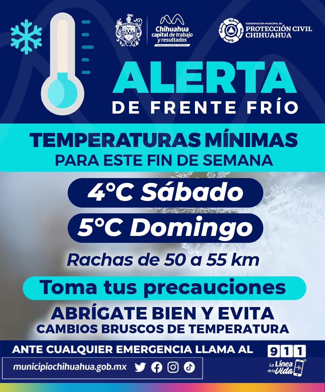 Leer másLa sensación térmica puede llegar a los 4°C y 5°C Chihuahua.- La Coordinación Municipal de Protección Civil informa a la ciudadanía que a partir de este sábado se espera un notorio descenso en la temperatura, con sensaciones térmicas de 4°C y 5°C, además de vientos fuertes, de acuerdo al pronóstico que emite el Servicio Meteorológico Nacional de CONAGUA. Para este fin de semana, se espera la entrada de un nuevo Frente Frío, el ...