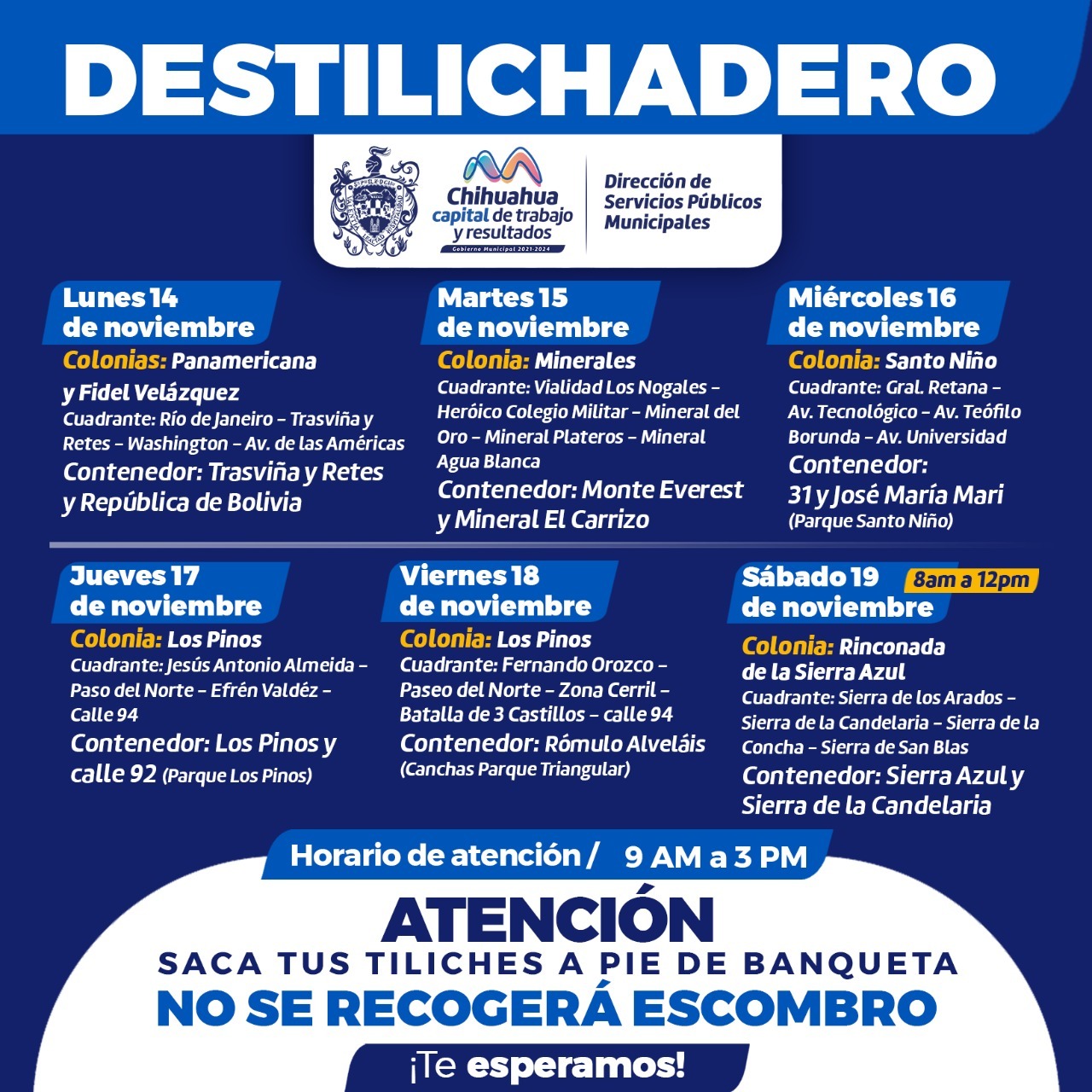 Chihuahua.- El Gobierno Municipal, a través de la Dirección de Servicios Públicos Municipales, informa a la ciudadanía el calendario del programa Destilichadero que se realizará del 14 al 19 de noviembre, en seis colonias de Chihuahua Capital. El Destilichadero consiste en retirar basura de grandes dimensiones que el camión recolector no puede trasladar, por lo que se pone a disposición de la población un contenedor en un punto fijo, en un ...