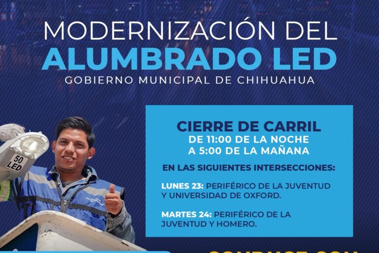 Leer másChihuahua.- El Gobierno Municipal, a través de la Dirección de Mantenimiento Urbano, informa a la ciudadanía por trabajos de modernización del alumbrado público con tecnología LED en los bajo puentes del Periférico de la Juventud que cruzan con la avenida Homero y en la Universidad de Oxford los días lunes y martes a partir de las 11:00 de la noche. Estas acciones, impulsadas por el alcalde Marco Bonilla, reflejan un compromiso ...