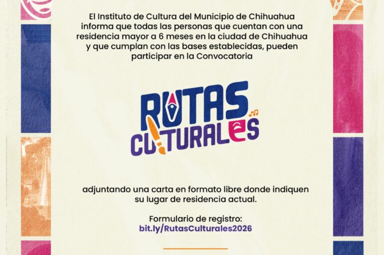Leer másChihuahua.- El Instituto de Cultura del Municipio, invita a la comunidad artística local a participar en la convocatoria Rutas Culturales 2026, un programa que busca llevar el arte y la cultura a distintos espacios públicos de la ciudad, al mismo tiempo que impulsa y da visibilidad al talento chihuahuense. La convocatoria abrió el pasado 6 de febrero y permanecerá vigente hasta el 27 de febrero de 2026. Está dirigida a artistas, ...