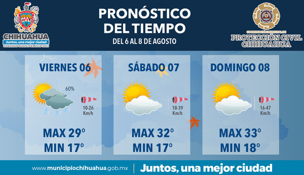 Leer másChihuahua.-Para este fin de semana en la capital del estado sólo se esperan lluvias durante este viernes, así lo informó la Coordinación Municipal de Protección Civil, de acuerdo al pronóstico que emite el Servicio Meteorológico Nacional de CONAGUA, en tanto los días sábado y domingo permanecerán mayormente soleados, por ello es importante seguir las recomendaciones al respecto para evitar deshidrataciones. Bianca Luz Nevárez Moreno, titular de la dependencia municipal, dijo que, ...