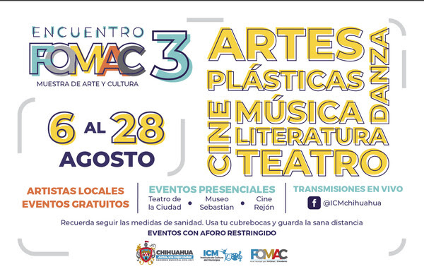Leer másChihuahua.- El Gobierno Municipal a través del Instituto de Cultura invita a la comunidad chihuahuense al programa de actividades artísticas y culturales “Encuentro FOMAC 3” donde las y los beneficiarios presentarán el resultado de cada uno de sus proyectos, el cual se desarrollará del 6 al 28 de agosto. En esta tercera emisión habrá conciertos musicales, danza, exposiciones, obras de teatro, largometrajes, conferencias entre otros, comenzando con la inauguración de la ...