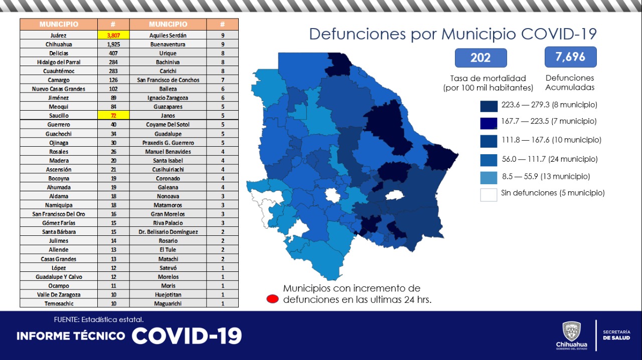 Leer másChihuahua.-La Secretaría de Salud confirmó 166 nuevos casos de Covid-19 para un acumulado general de 72 mil 963, además de cinco defunciones más y un total de 7 mil 696. A través del informe epidemiológico señaló que hay ya 62 mil 334 (+115) pacientes que se han recuperado de la enfermedad, 44 mil 012 (+415) descartados y 725 (-14) sospechosos. Por municipios, los contagios confirmados se distribuyen de la siguiente manera: 33 ...