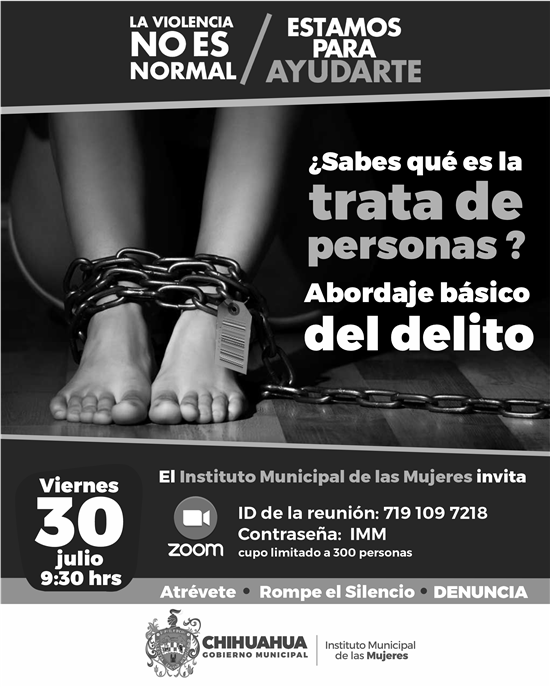 Leer másChihuahua.- El Instituto Municipal de las Mujeres (IMM), impartirá la plática “¿Sabes qué es la trata de personas? Abordaje básico del delito” el próximo viernes 30 de julio a las 9:30 horas vía Zoom. El objetivo de esta sesión es sensibilizar y orientar a las y los asistentes sobre la prevención y atención a la violencia familiar y de género, desde una perspectiva que atienda a los derechos humanos. Las personas interesadas ...