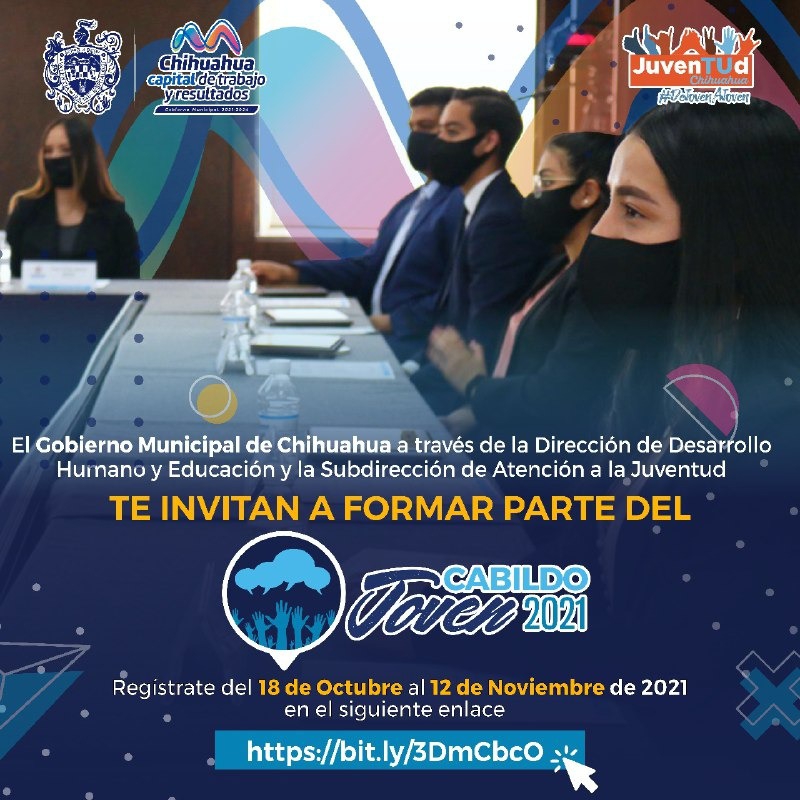 Chihuahua.- Con la finalidad de integrar a la juventud chihuahuense en la vida pública de nuestra ciudad, el Gobierno Municipal, a través de la Dirección de Desarrollo Humano y Educación, invita a las y los jóvenes a formar parte del Cabildo Joven 2021. El registro permanecerá abierto hasta el 12 de noviembre, el cual podrá hacerse de manera virtual en el link https://bit.ly/3DmCbcO; o bien, presentándose en las oficinas de la ...