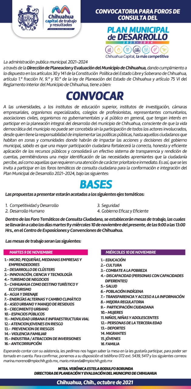 Leer másChihuahua.- El Gobierno Municipal, a través de la Dirección de Planeación y Evaluación, invita a la ciudadanía a participar en los foros temáticos de consulta ciudadana que se llevarán a cabo el próximo martes 9 y miércoles 10 de noviembre en el Centro de Convenciones. De 9:00 a 13:00 horas, se recibirán propuestas de ciudadanos, académicos, cámaras empresariales y organizaciones civiles, que abonen a los ejes temáticos: Competitividad y Desarrollo, Desarrollo ...