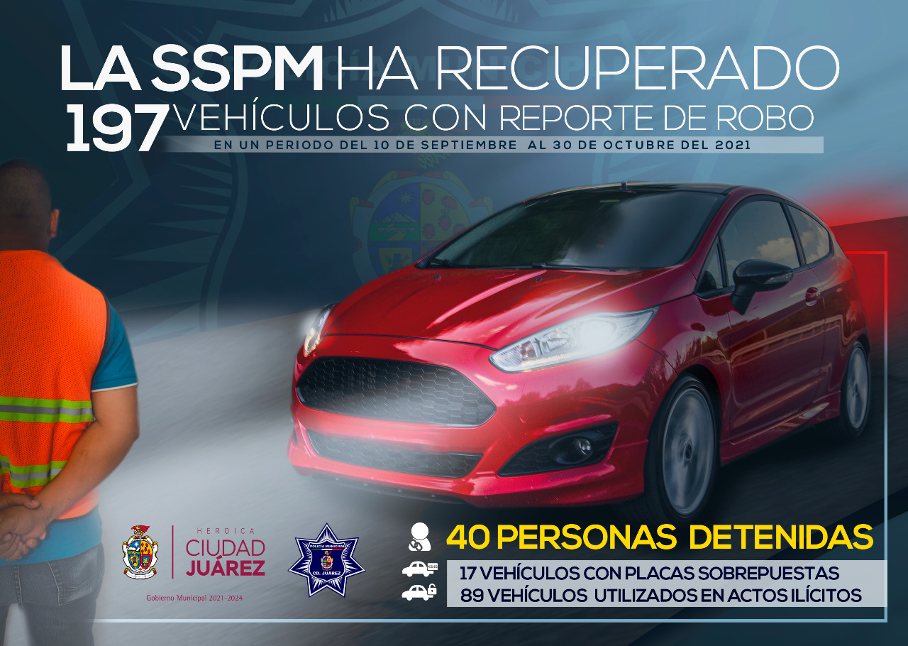 Juárez.- La Secretaría de Seguridad Pública Municipal informa que se han recuperado 197 vehículos de diversas marcas y modelos con reporte de robo en un periodo del 10 de septiembre al 30 de octubre del presente año. Así mismo, se comunica que a través de las labores de prevención y vigilancia se realizó la detención de 40 personas en posesión de vehículos con reporte de robo, mismas que fueron consignadas ante ...