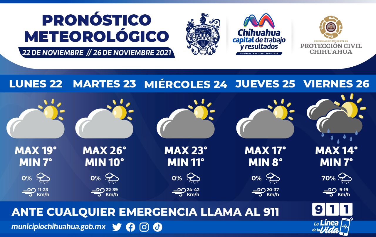 Leer másChihuahua.- Debido al Frente Frío número 10, esta semana se presentará un descenso en las temperaturas en la ciudad con días mayormente nublados, así lo informó la Coordinación Municipal de Protección Civil, de acuerdo al pronóstico que emite el Servicio Meteorológico Nacional, por lo cual se exhorta a la población a atender las recomendaciones que se emiten por parte de las autoridades para evitar complicaciones de salud. Joel Estrada Castillo, encargado ...