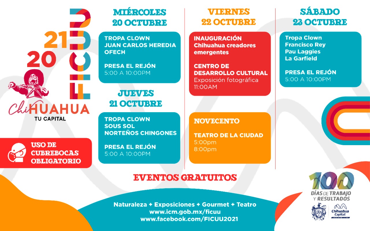Leer másChihuahua.- Como parte de las actividades del Festival Internacional de la Ciudad de Chihuahua (FICUU) 2021, este miércoles 20 de octubre a las 17:00 horas se retomarán las presentaciones de artistas en el escenario ubicado en la presa El Rejón, los interesados deberán llegar temprano para poder obtener una pulsera, que les dará acceso a la zona vallada cercana al escenario. Este 20 de octubre se presentará el barítono Juan Carlos ...