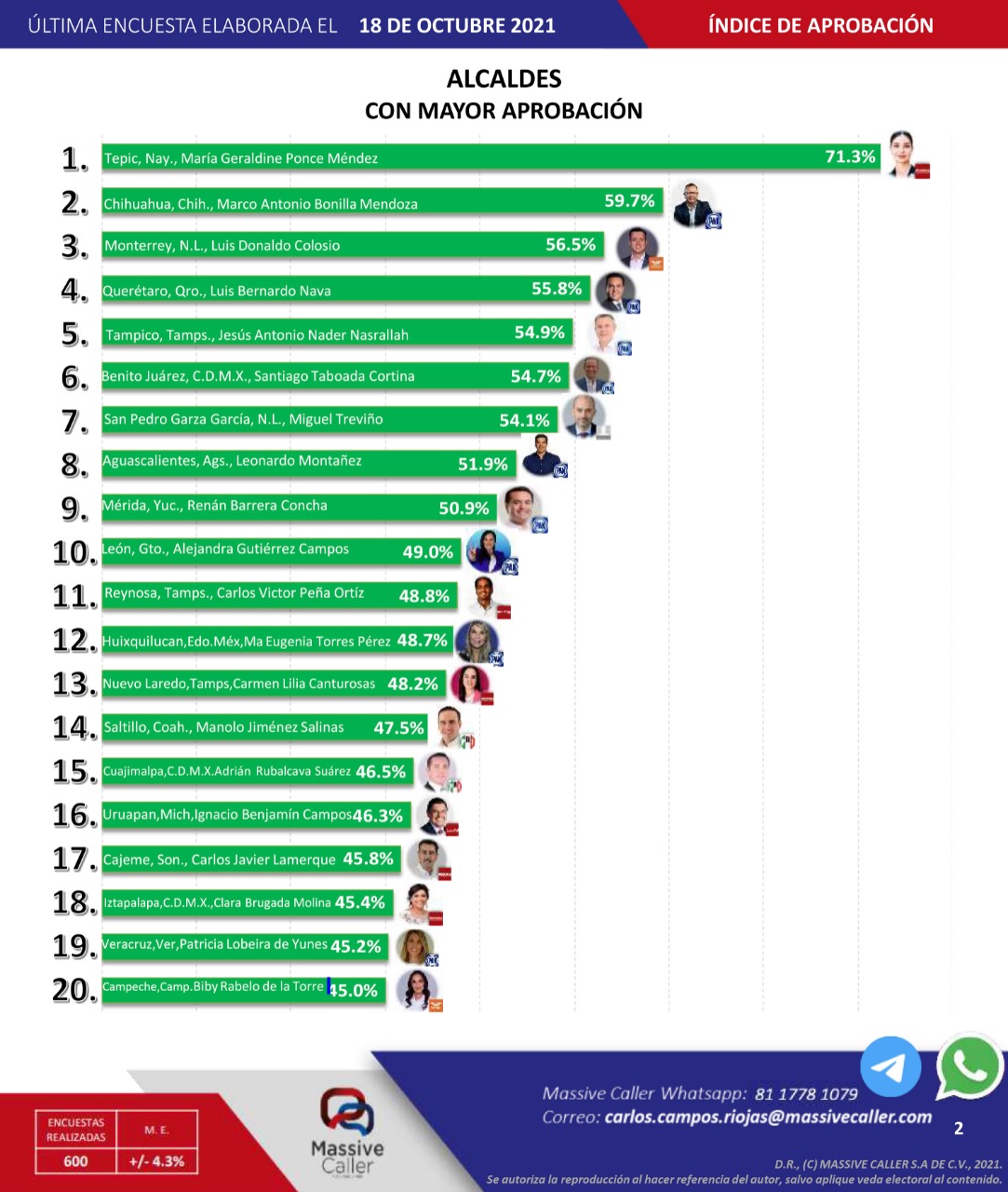 Chihuahua.- De acuerdo a la última encuesta de Massive Caller publicada este día, el alcalde capitalino de Chihuahua, Marco Antonio Bonilla Mendoza se ubica dentro de los mejores alcaldes de México en los índices de aprobación y confianza. El alcalde de Chihuahua obtuvo el 59.7% en el rubro de aprobación y en este top, fue el único presidente municipal de Chihuahua. En el tema de mayor percepción de confianza, Marco Bonilla se ...