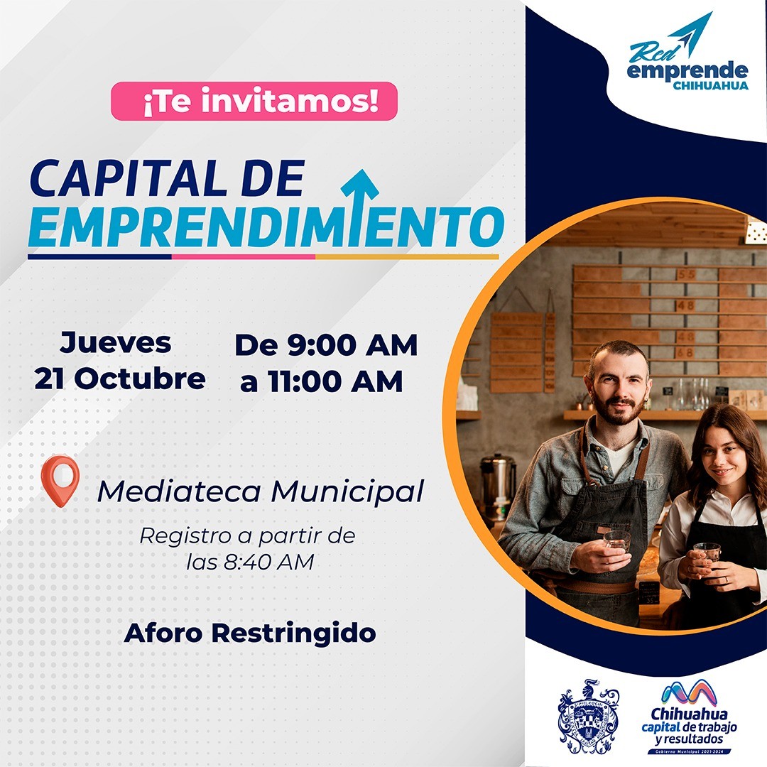 Leer másChihuahua.- El Gobierno Municipal a través de la Dirección de Desarrollo Económico y Turismo, invita a los emprendedores a participar a la capacitación “Capital Emprendimiento”, este 21 de octubre a las 9:00 de la mañana en la Mediateca Municipal, el cual tendrá cupo limitado. Este evento es organizado por la Subdirección de Innovación para incrementar el potencial de los negocios locales, capacitar e informar de apoyos y programas del Gobierno Municipal ...
